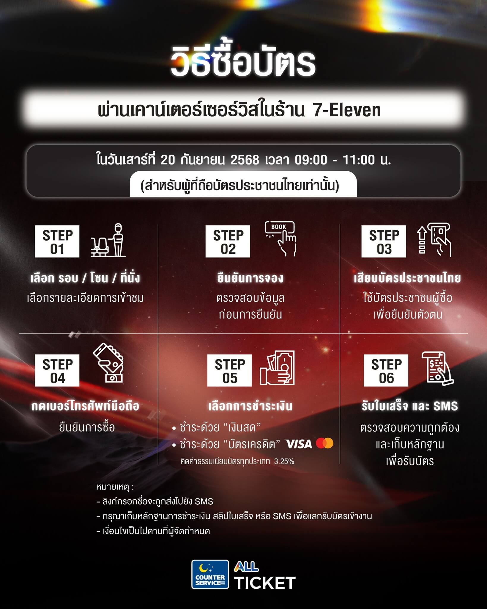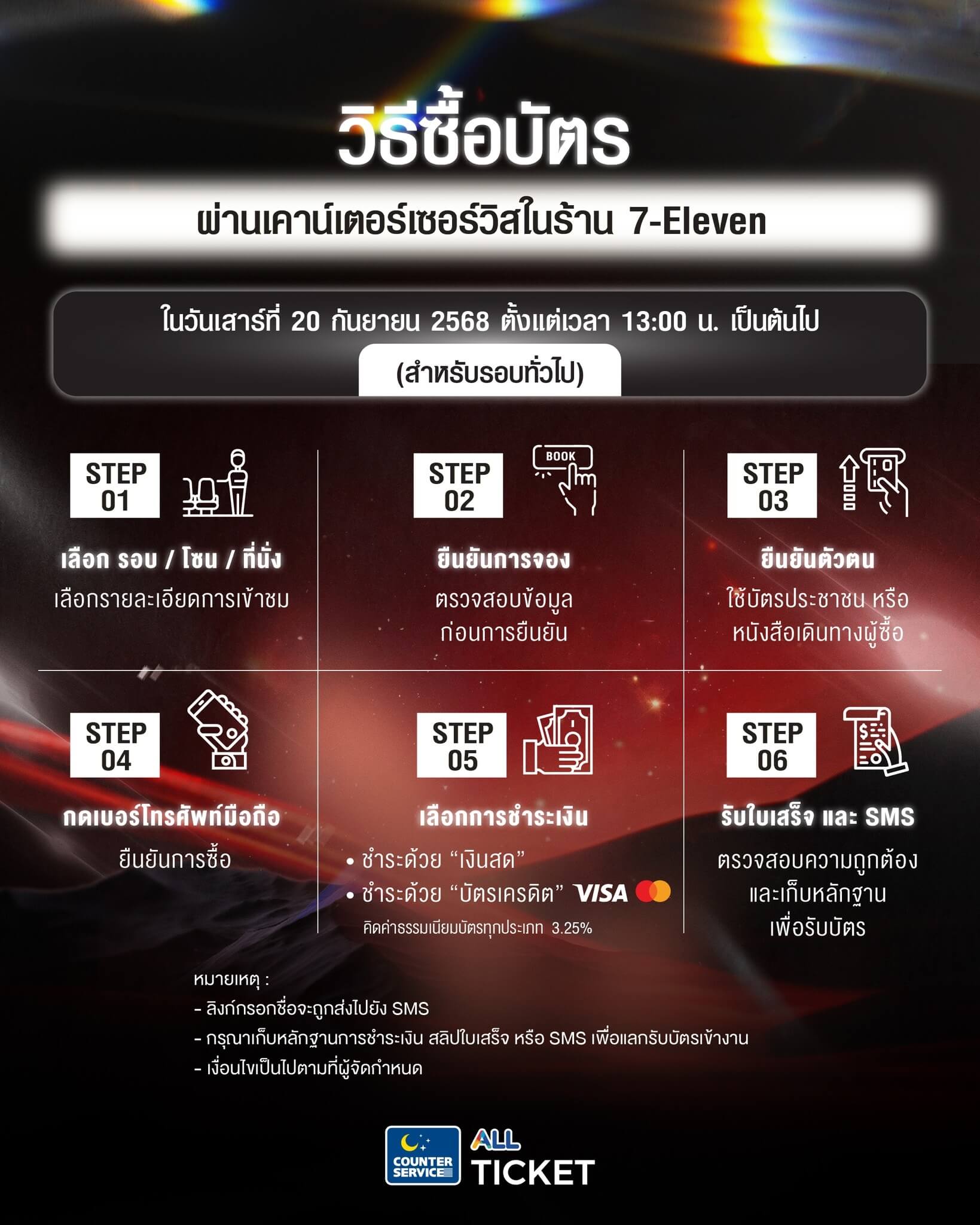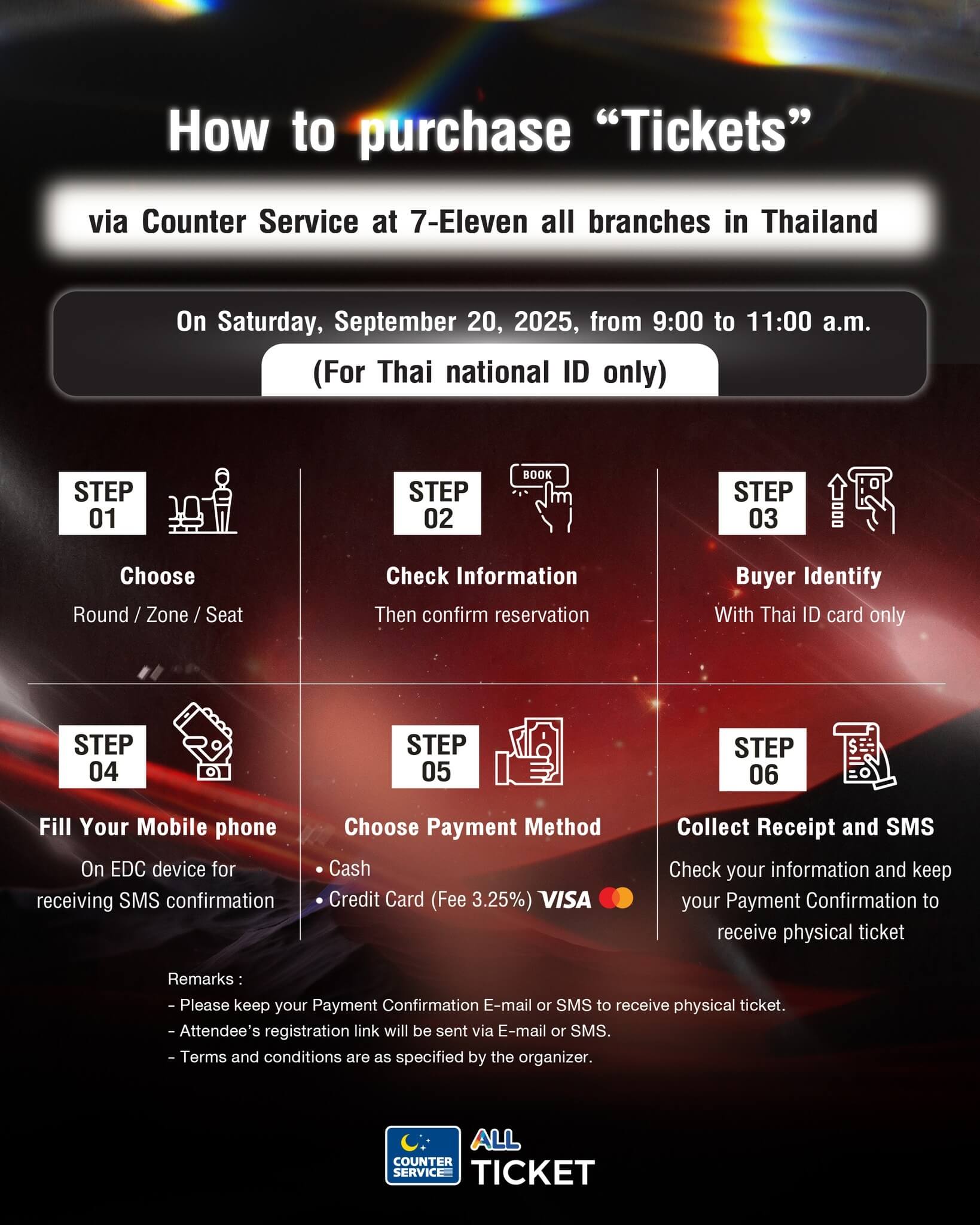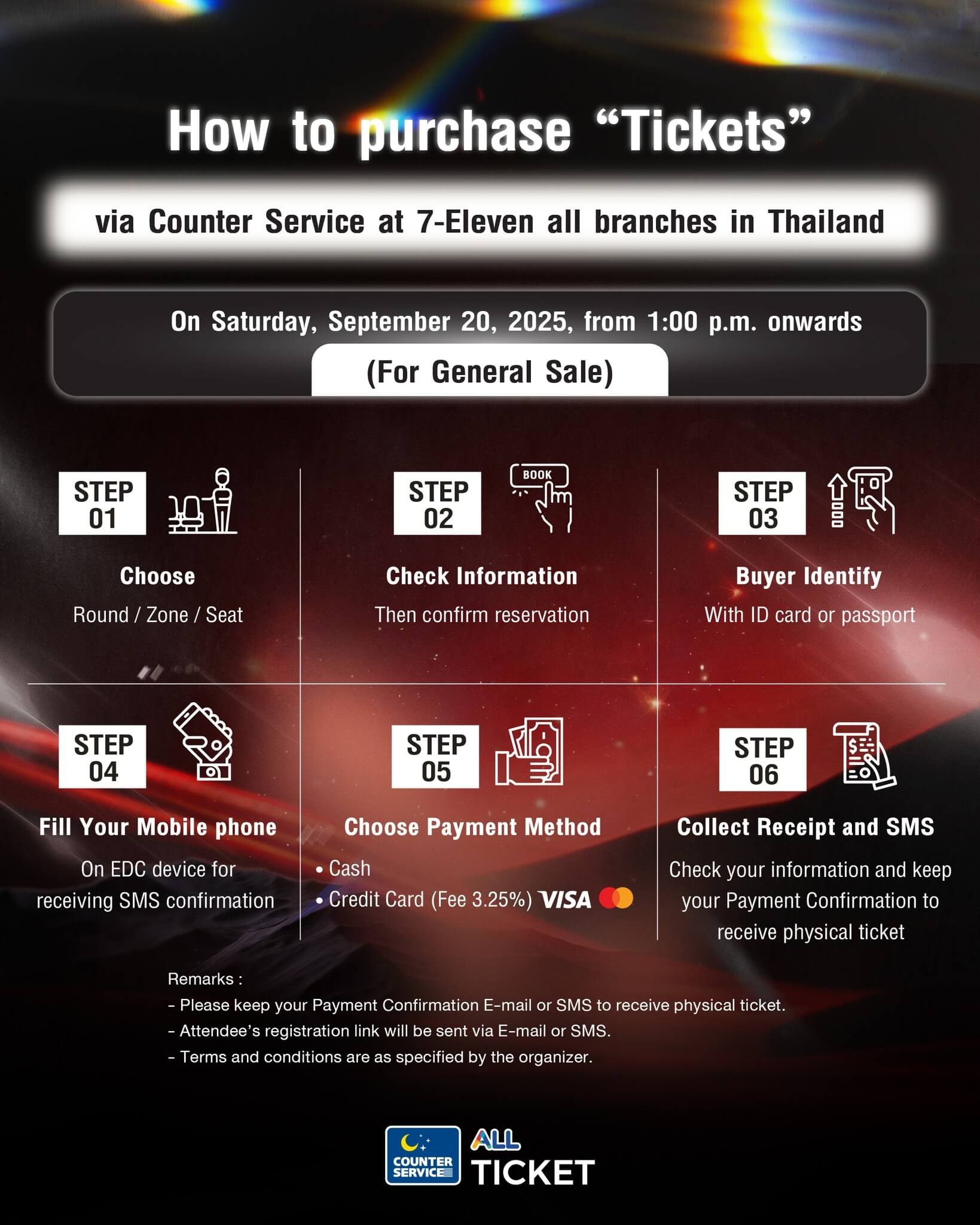 เริ่มจำหน่ายบัตร วันเสาร์ที่ 20 กันยายนนี้ ทางเคานท์เตอร์เซอร์วิสของ 7-11 ทั่วไทยและเว็บไซต์ All ticket บัตรราคา 6,500 / 6,000 / 5,500 / 5,000 / 4,800 / 3,800 / 2,800 / 2,500 / 1,500 บาท สำหรับผู้ที่ต้องการประสบการณ์แบบ Exclusive ยังมี VIP Rooms 8 ห้อง ราคาที่นั่งละ 7,800 บาท และ VVIP ROOMS มีทั้งหมด 4 ห้อง ราคาที่นั่งละ 8,800 บาท