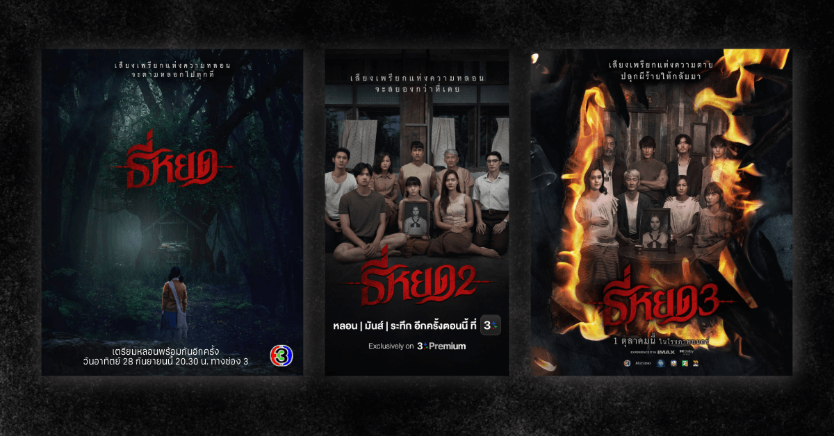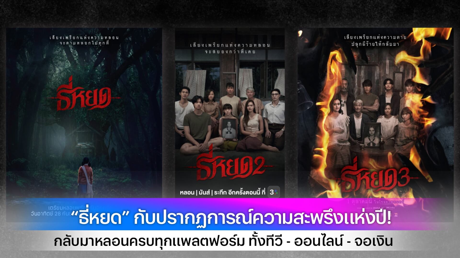 “ธี่หยด” ภาพยนตร์แนวสยองขวัญฟอร์มยักษ์จาก ช่อง 3 และ M Studio ที่สร้างปรากฏการณ์ครั้งสำคัญ ขึ้นแท่นภาพยนตร์ไทยที่ทำรายได้สูงสุดในประวัติศาสตร์ และยังเป็นผลงานที่ทำให้คนไทยหันกลับมาพูดถึง “หนังผีไทย” แบบจริงจังอีกครั้ง ตำนาน “เสียงธี่หยด” ที่ครั้งหนึ่งถูกเล่าผ่านกระทู้พันทิปจนดังระเบิด และกลายมาเป็นนิยาย ธี่หยด…แว่วเสียงครวญคลั่ง ของนักเขียนหนุ่ม กฤตานนท์ กิตติวิรยานนท์ ลูกชายเจ้าของเรื่องจริง ก่อนจะนำมาเล่าต่อใน The Ghost Radio ทำให้ถูกต่อยอดเป็นภาพยนตร์สุดสะพรึงที่ใคร ๆ ก็ต้องพูดถึง และวันนี้เสียงสยองนั้นกลับมาสั่นสะเทือนจออีกครั้ง! เรื่องราวปี พ.ศ. 2515 ที่หมู่บ้านห่างไกล จ.กาญจนบุรี ต้องผวาเมื่อมีเสียงปริศนา “ธี่หยด… ธี่หยด…” แว่วกลางดึก และเด็กสาวเสียชีวิตอย่างเป็นปริศนา หลังจาก ยักษ์ (ณเดชน์ คูกิมิยะ) ปลดประจำการทหารกลับมาช่วยงานที่บ้านกับพ่อแม่พร้อมน้อง ๆ อีก 5 คน ได้แก่ ยศ(กาจบัณฑิต ใจดี), ยอด(พีระกฤตย์ พชรบุณยเกียรติ), หยาด(เดนิส เจลีลชา คัปปุน), แย้ม(รัตนวดี วงค์ทอง) และ ยี่(ณัฐชา เจสสิก้า พาโดวัน) แต่แล้วความตายและเงามืดกลับคืบคลานเข้ามาในครอบครัว เมื่อแย้มเริ่มมีอาการผิดปกติหลังเผชิญหน้าหญิงชุดดำ ความลับอันดำมืดของหมู่บ้านจึงถูกเปิดเผยทีละน้อย เตรียมหลอนพร้อมกันอีกครั้ง วันอาทิตย์ 28 กันยายนนี้ 20.30 น. ทางช่อง 3