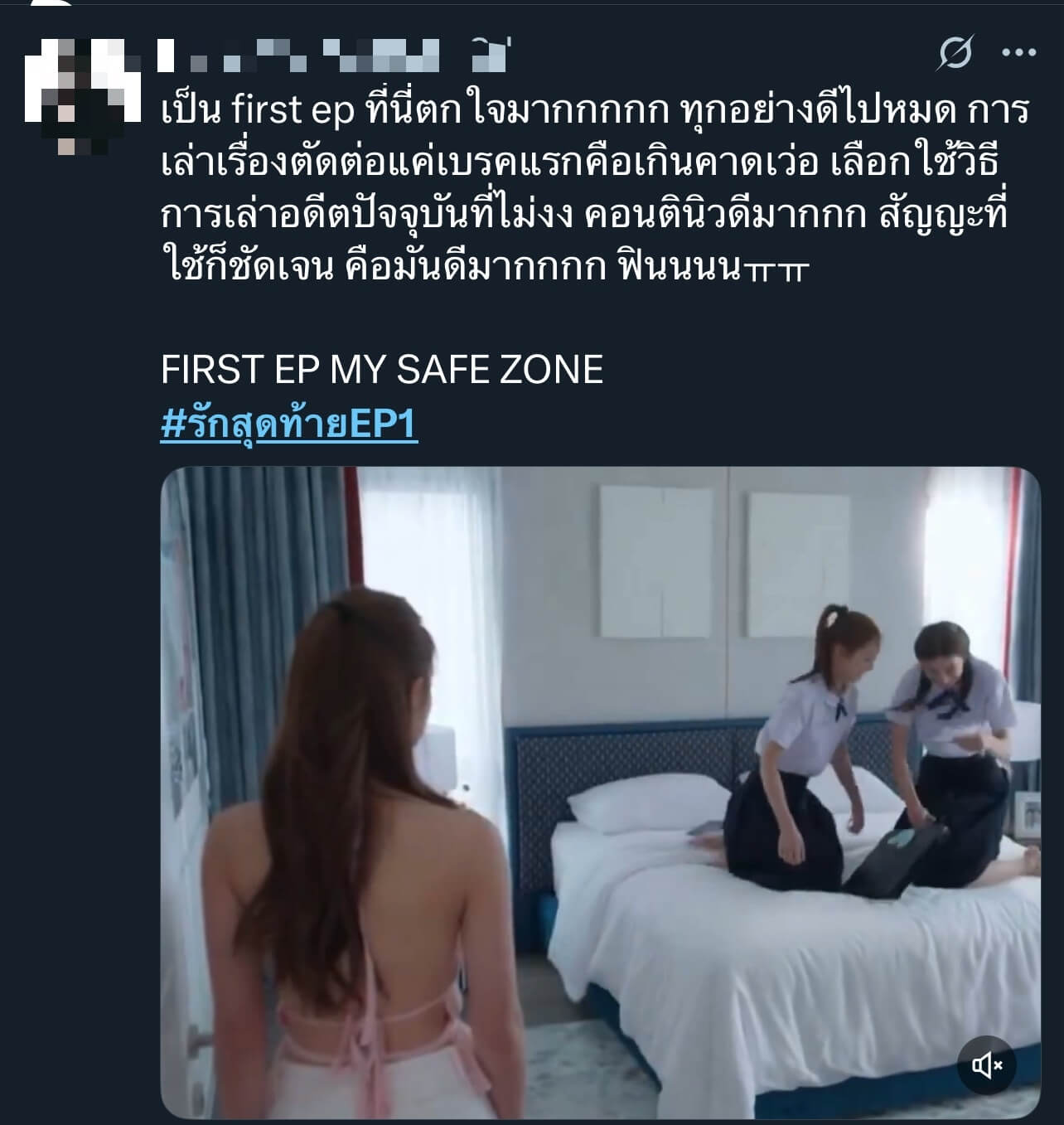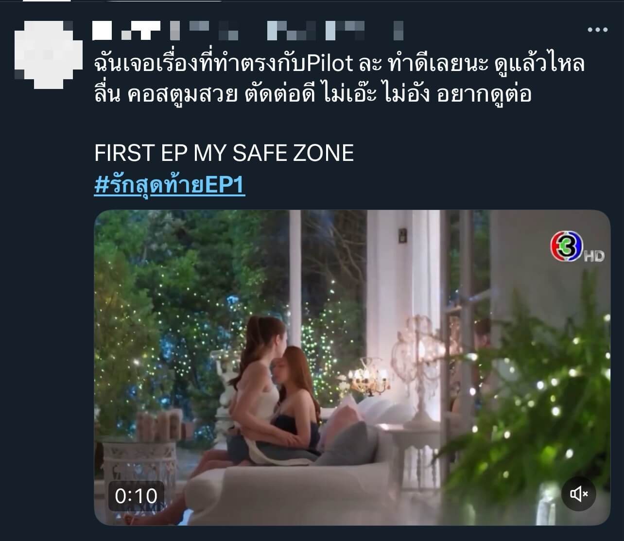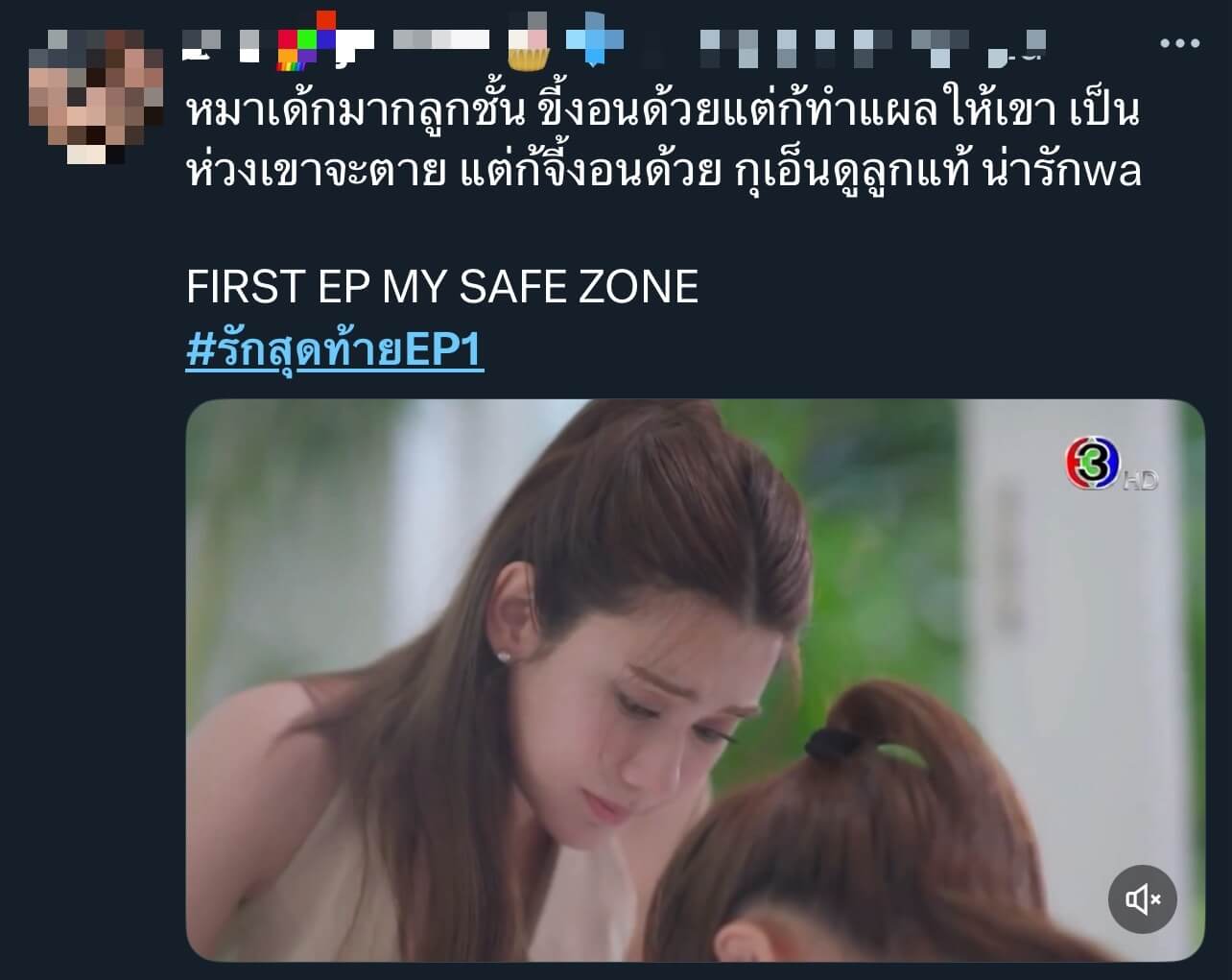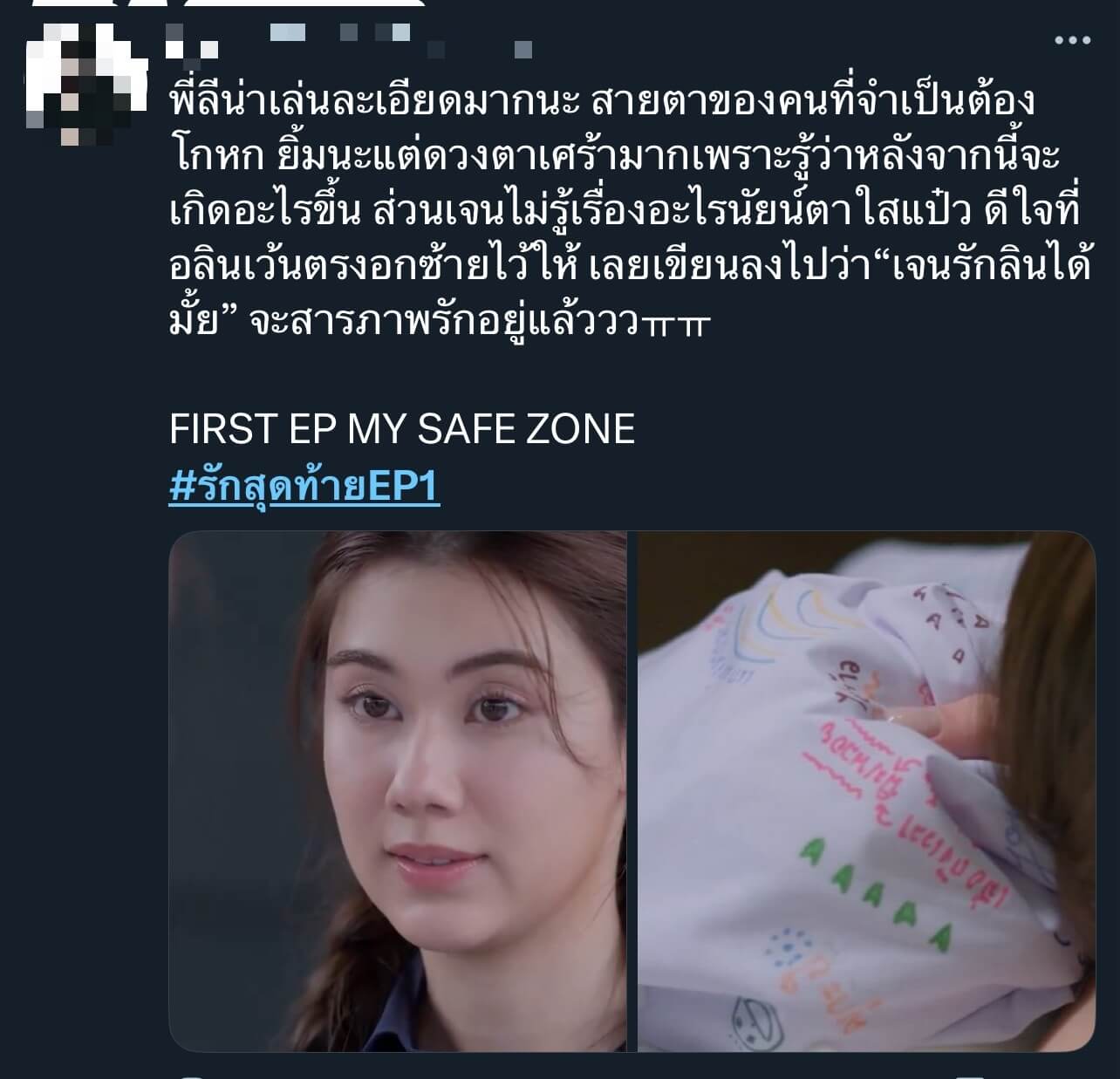 “รักสุดท้าย My Safe Zone The Series” จากทาง BEC World Original Series ทางช่อง 3 หลังจากออกอากาศให้ได้ชมกันไปแล้วในตอนแรกกระแสแรงเกินต้าน จากเคมีที่เข้ากันลงตัวจนคนดูใจละลายของ “ลีน่า