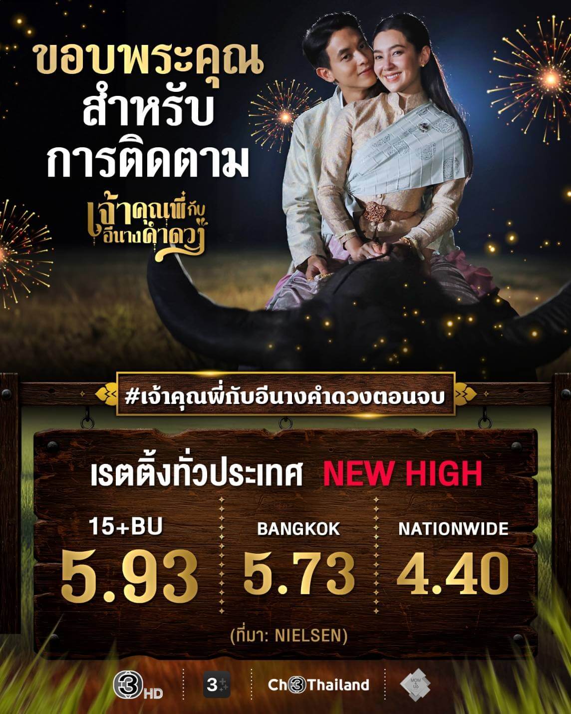 ปิดฉากอย่างงดงามและอบอุ่นหัวใจ สำหรับละครฟอร์มยักษ์แห่งปี “เจ้าคุณพี่กับอีนางคำดวง” ทางช่อง 3 ฝีมือผู้จัดและกำกับของ วรวิทย์ ศรีสุภาพ ค่าย มัม แอนด์ อัส ที่ลาจอไปพร้อมเสียงฮือฮาและคำชมล้นหลามโซเชียล กับความเข้มข้นของเนื้อเรื่องผสมความโรแมนติกครบรส จนทำให้ตอนอวสานคว้าเรตติ้งสูงสุดทั่วประเทศถึง 4.40 ส่วนในพื้นที่กรุงเทพฯ พุ่งแตะ 5.73 และกลุ่มผู้ชม 15 BU+ (Bangkok & Urban) ฟาดเรตติ้งนิวไฮไปถึง 5.93 สร้างสถิติใหม่ให้กับละครไทยช่วงไพร์มไทม์อีกครั้ง!