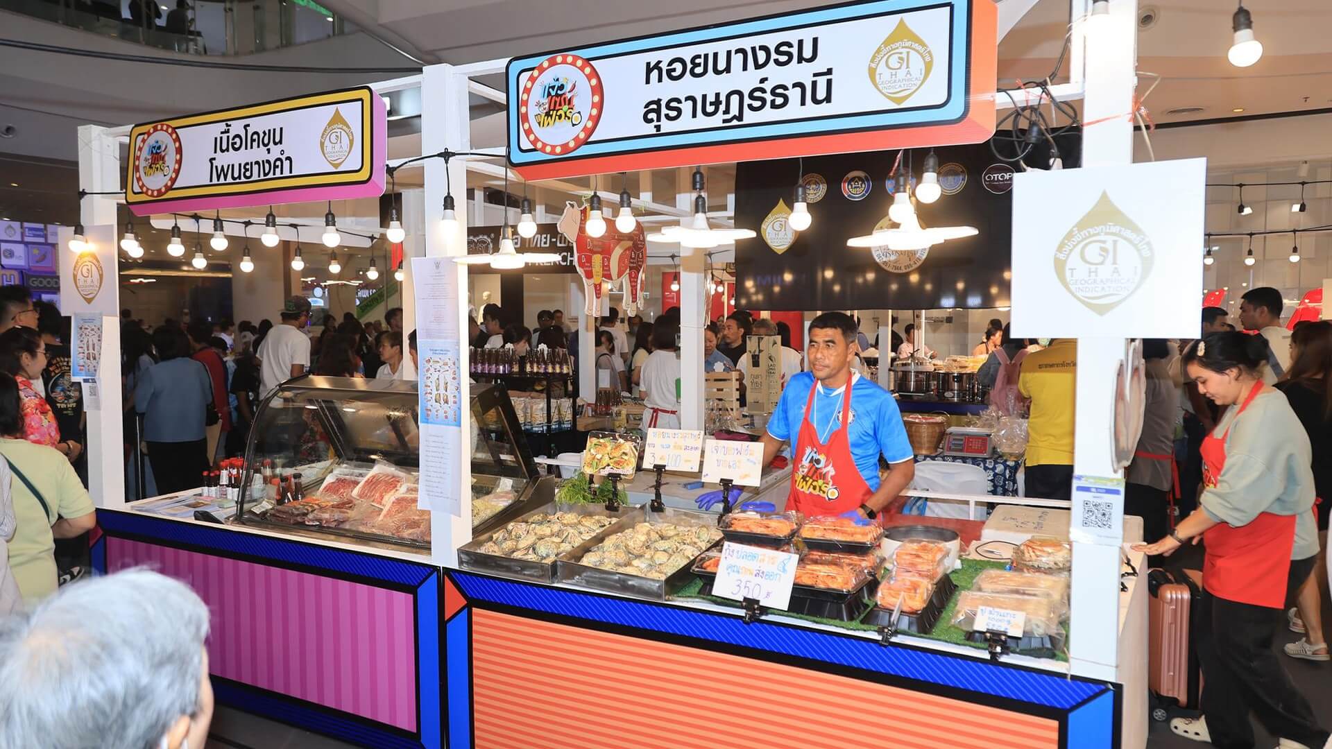 เริ่มต้นกันที่ (บูธที่ 63) ปลาทูแม่กลอง จ.สมุทรสงคราม ซึ่งเป็นปลาทูที่มีลักษณะเฉพาะตัว หน้างอ คอหัก ตัวสั้น เนื้อแน่น มันและหวาน มีให้เลือกหลากหลาย อาทิ ปลาทูนึ่ง ปลาทูซาเตี๊ยะ ปลาทูสามรส ปลาทูแดดเดียว ปลาทูมัน ผัดพริกปลาทู ผัดฉู่ฉี่ปลาทู และ หอยดองแม่กลองพร้อมเครื่องยำ ต่อกันที่ (บูธที่ 65) กุ้งก้ามกรามบางแพ จ.ราชบุรี เป็นสินค้าสิ่งบ่งชี้ทางภูมิศาสตร์ ซึ่งมีลักษณะพิเศษคือ มีเปลือกสีน้ำเงินมันเงา ก้ามสีน้ำเงินหรือสีครามปนสีทอง เนื้อแน่นเต็มเปลือก เมื่อสุกจะมีรสชาติหวาน มีมันมาก และไม่มีกลิ่นคาว นำมาจำหน่ายหลากหลายเมนู ไม่ว่าจะเป็น กุ้งอบซอส ผัดหมี่กุ้งใหญ่ กุ้งเนื้อ (นึ่ง,ทอด,เซีย) พริกเผามันกุ้ง และ มันกุ้งปรุงรส