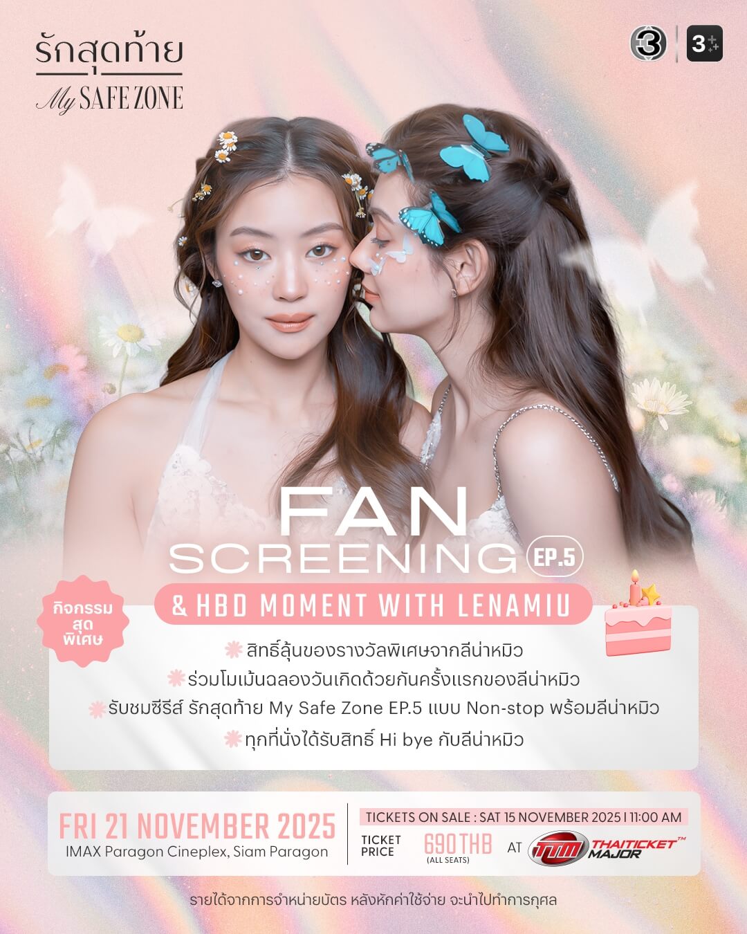 พร้อมเปิดพื้นที่ให้ได้มาฟินในโมเมนต์สุดพิเศษไปด้วยกันกับซีรีส์ “รักสุดท้าย My Safe Zone The Series” ทางช่อง 3 ที่ชวนมาฉลองความอบอุ่นร่วมกับสองสาวสุดฮอต “ลีน่า ลลินา” และ “หมิว ณัชชา” ในงาน “Fan Screening EP.5 & HBD Moment with LenaMiu” ที่จะจัดขึ้นในวันศุกร์ที่ 21 พฤศจิกายน 2568 เวลา 19.00 – 22.00 น. ณ IMAX Paragon Cineplex สยามพารากอน
