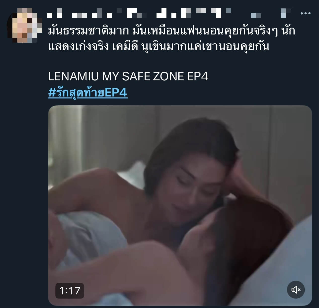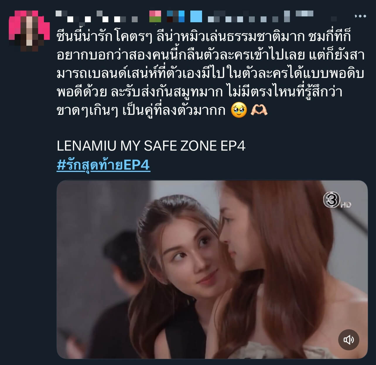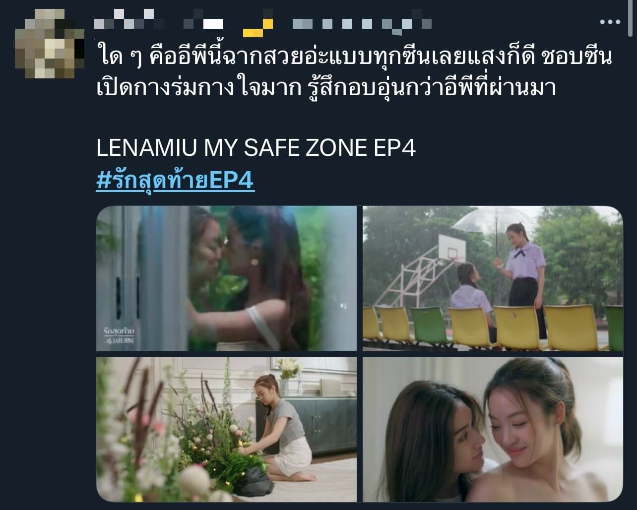 กระแสแรงไม่มีเบาเลยจริง ๆ สำหรับซีรีส์มาแรง “รักสุดท้าย My Safe Zone The Series” ล่าสุดสร้างสถิติพา อีพี 4 ทำเอาโซเชียลลุกเป็นไฟ จนพายอดดูสดทะยานสูงถึง 2.3 ล้านวิว ดันโมเมนต์สุดคิ้วท์ อลิน (ลีน่า ลลินา) และ เจน (มิว ณัชชา) ที่เปลี่ยนสถานะเป็นแฟนขึ้นเทรนด์ X ไทยอันดับ 2 และแรงขึ้นไปถึง อันดับ 7 บนเทรนด์โลก กับแฮชแท็ก #รักสุดท้ายEP4 ขณะที่ยอดรับชมรวมตลอดทั้ง 4 ตอนแรกทะลุ 8.5 ล้านวิว เป็นที่เรียบร้อย