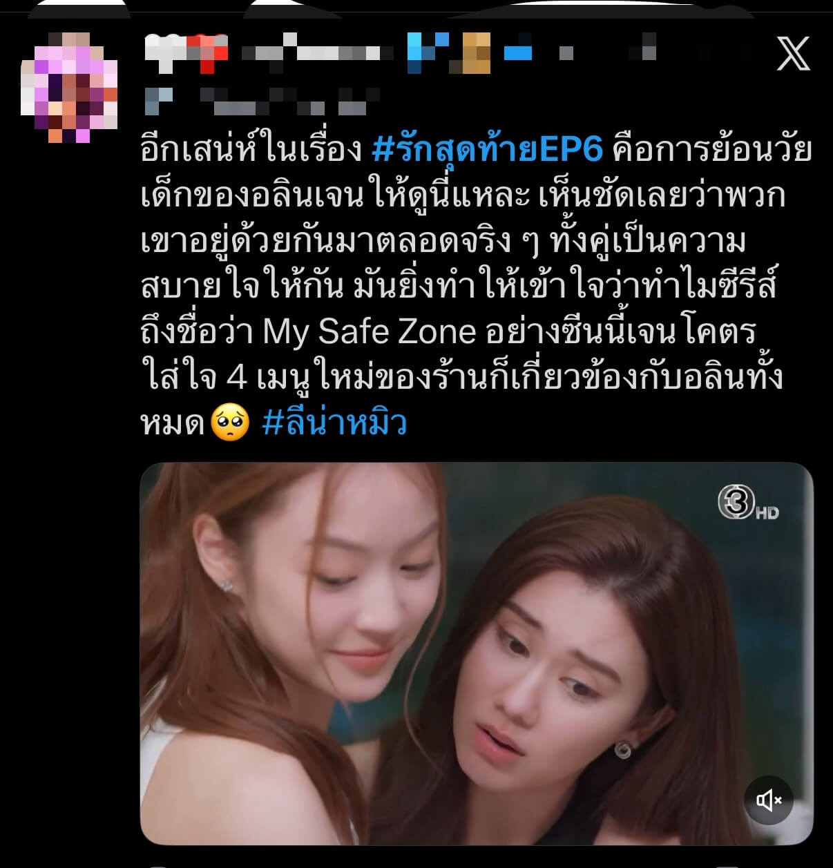 โดนตกแล้วโดนตกอีกกับความน่ารักของ อลิน (ลีน่า ลลินา) และ เจน (หมิว ณัชชา) จากซีรีส์สุดฮอต “รักสุดท้าย My Safe Zone The Series” ทางช่อง 3 ยังคงโกยกระแสความปังอย่างต่อเนื่อง หลังล่าสุดทำโซเชียลแทบลุกเป็นไฟ กับการพัฒนาจากเพื่อนคนละขั้ว สู่การเป็นเซฟโซนของกันและกัน แต่อีพี 6 ที่ผ่านมา กลับมีตัวแปรสำคัญที่เข้ามาล่วงล้ำเซฟโซนของอลินและเจนที่ทำคนดูถึงขั้นกำยาแก้ปวด