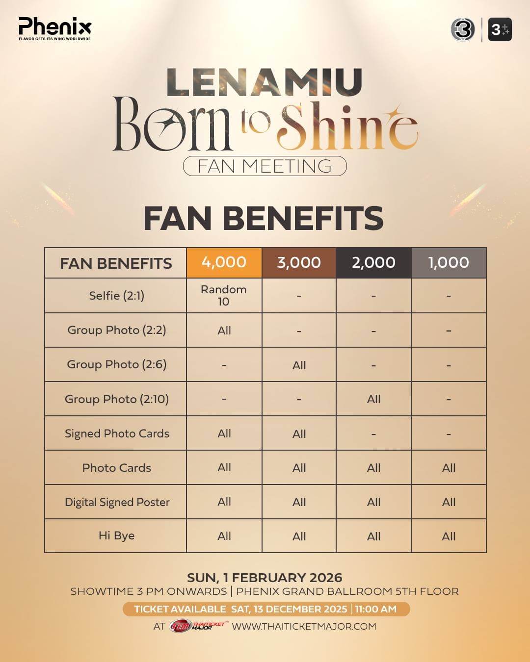 วอร์มนิ้วเตรียมกดบัตรมาใกล้ชิดกับ “ลีน่า - หมิว” แบบเอ็กซ์คลูซีฟ ที่เต็มไปด้วยเซอร์ไพรส์และโมเมนต์พิเศษที่จะทำให้คุณได้ฟินไม่รู้ลืมกับงาน “LENAMIU Born To Shine FAN MEETING” สามารถติดตามรายละเอียดเพิ่มเติมและอัปเดตทุกความเคลื่อนไหวทางโซเชียลได้ที่ Ch3Thailand และ 3 Plus