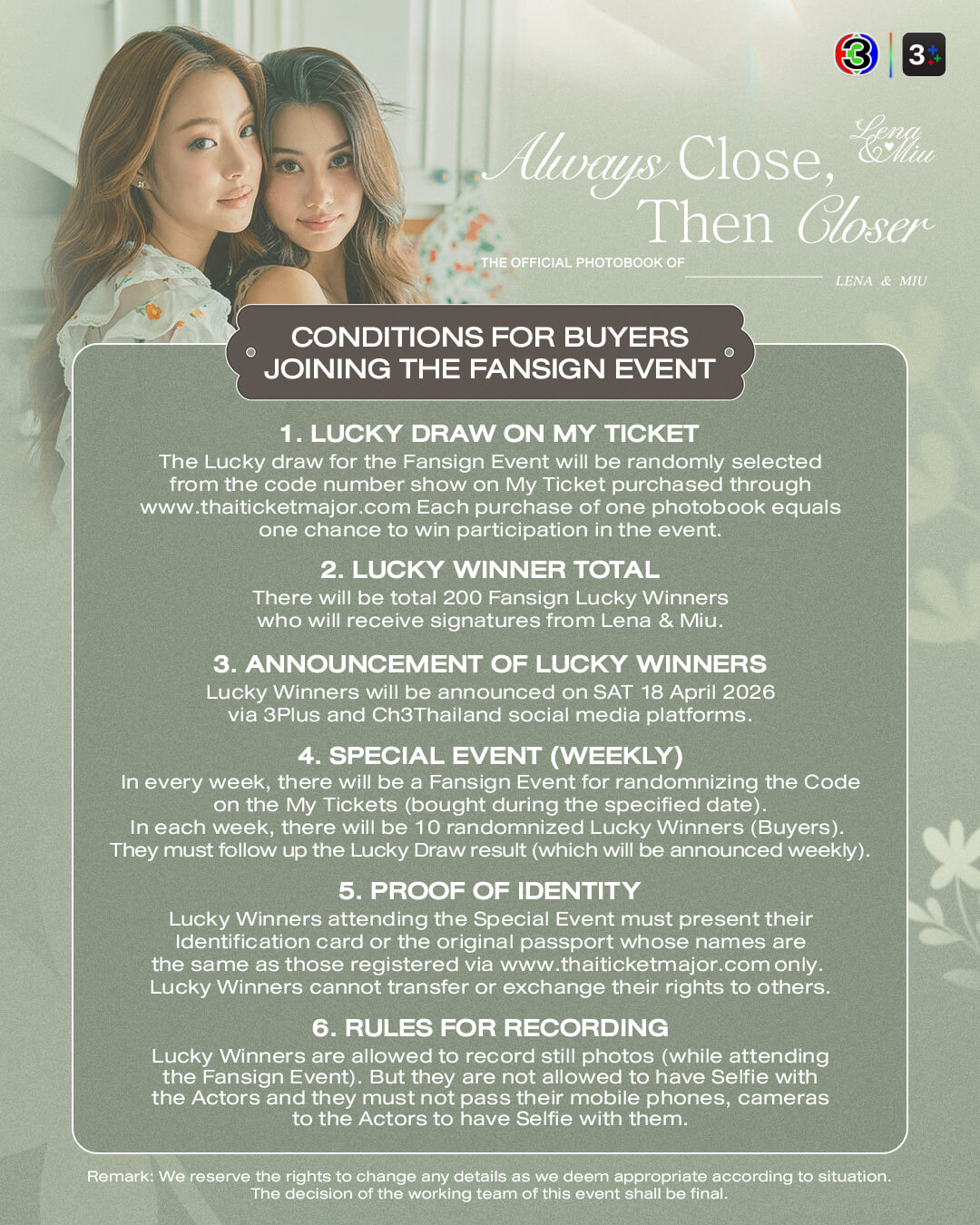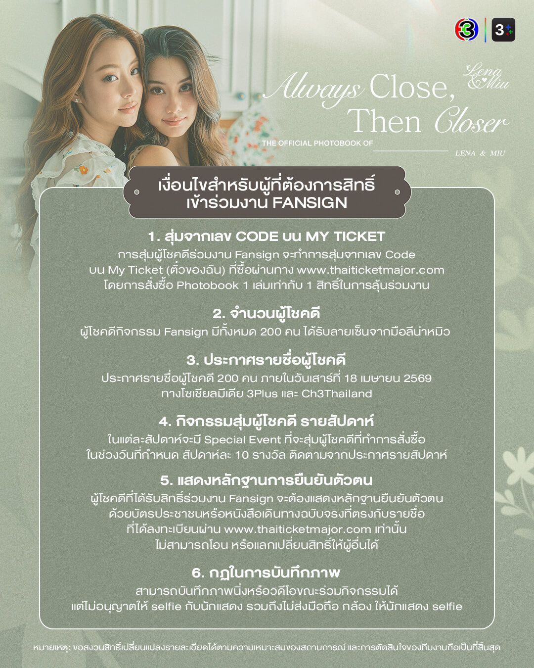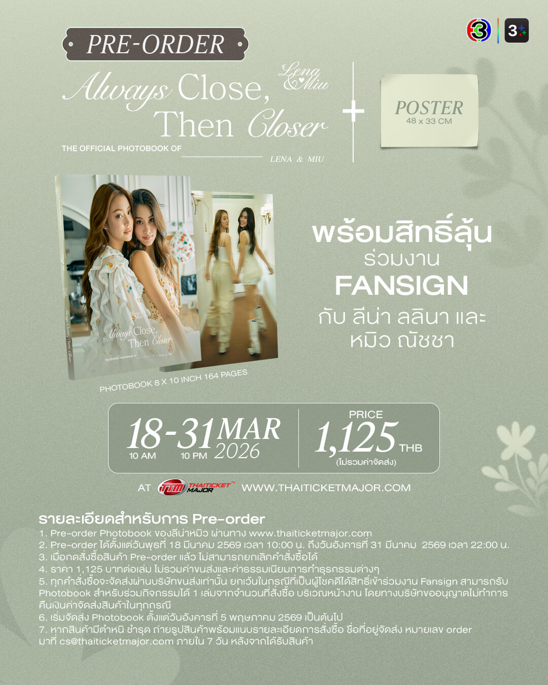เตรียมจับจองเป็นเจ้าของบันทึกความพิเศษครั้งนี้ได้ใน ราคา 1,125 บาท ทุกการสั่งซื้อมีสิทธิ์ลุ้นกิจกรรม Fansign สุด exclusive จำนวน 200 ท่าน ติดตามรายละเอียด Special Event รายสัปดาห์ได้ทางโซเชียล Ch3Thailand และ 3Plus โดยจะเปิดพรีออเดอร์ตั้งแต่วันพุธที่ 18 มีนาคม 2569 เวลา 10:00 น. ถึง วันอังคารที่ 31 มีนาคม 2569 เวลา 22:00 น. สั่งจองได้ที่ www.thaiticketmajor.com ติดตามรายละเอียดเพิ่มเติมได้ทาง Ch3 Thailand และ 3Plus