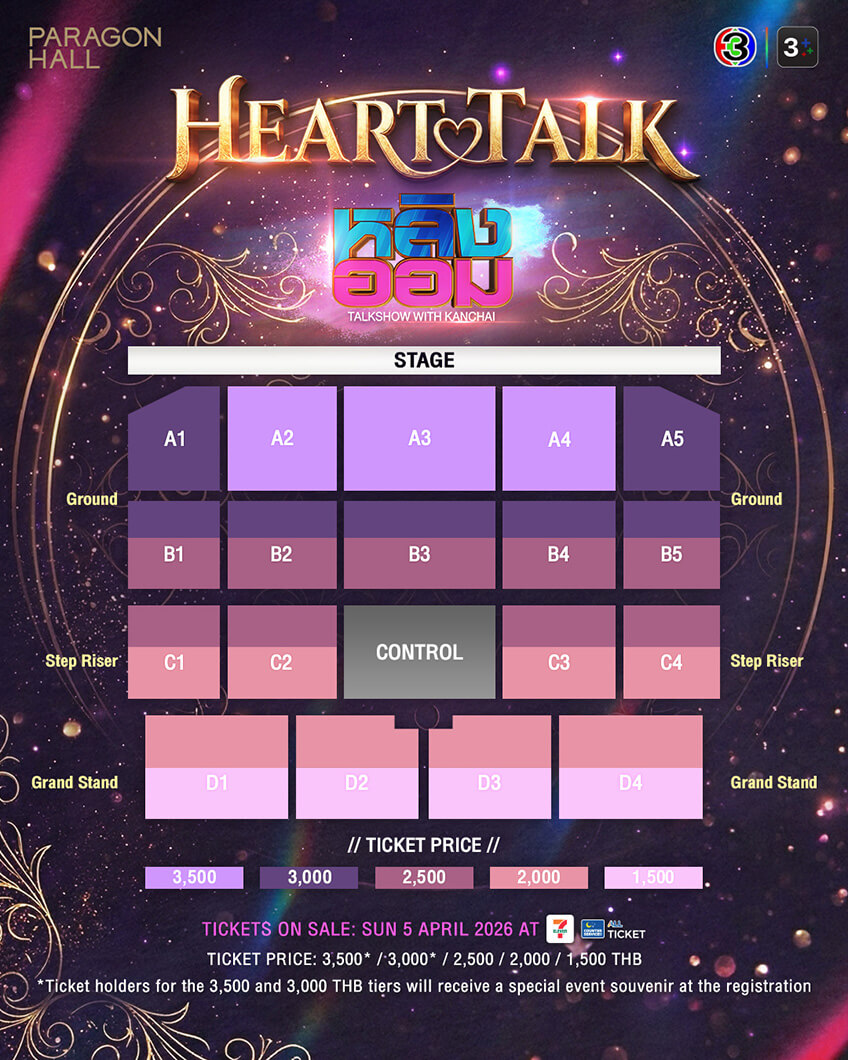 งานนี้รับรองว่าเข้มข้น ครบทุกอารมณ์ ทั้งโมเมนต์ฟิน โมเมนต์จริงใจ และเรื่องราวที่หลายคนอยากรู้ เตรียมสัมผัสด้วยตัวเองในวันเสาร์ที่ 25 เมษายน 2569 ณ พารากอน ฮอลล์ ชั้น 5 สยามพารากอน เริ่มจำหน่ายบัตรในวันอาทิตย์ที่ 5 เมษายน 2569 แบ่งออกเป็น 2 ช่วงเวลา ได้แก่