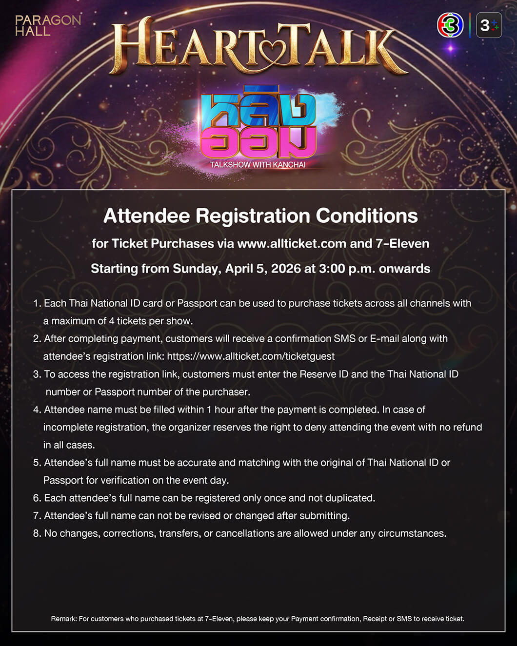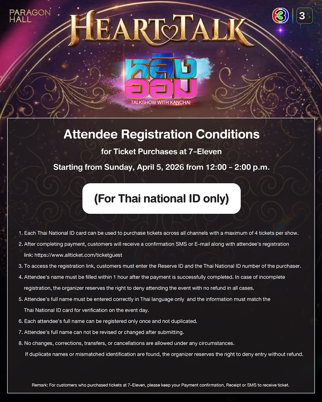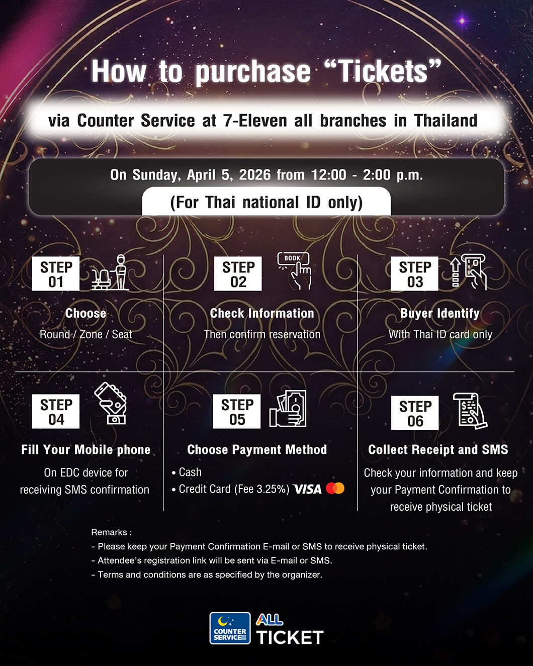 -รอบผู้ที่ถือบัตรประชาชนไทย เริ่มจำหน่ายบัตร เวลา 12:00 – 14:00 น.(GMT+7) ที่เคาน์เตอร์เซอร์วิสในร้าน 7-Eleven ทุกสาขาทั่วประเทศไทย