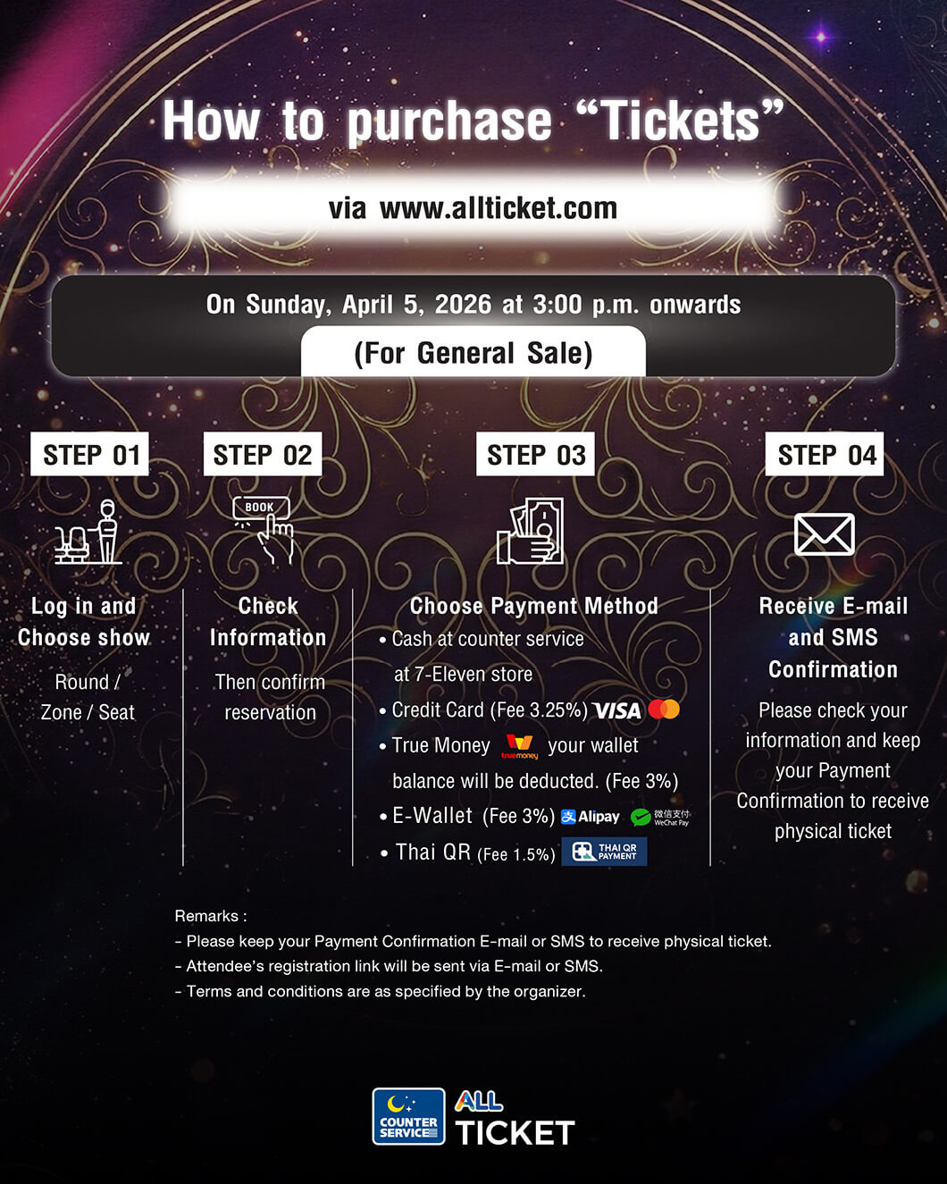 -รอบทั่วไป เริ่มจำหน่ายบัตร เวลา 15:00 น.(GMT+7) เป็นต้นไป ทางเว็บไซต์ Allticket รวมถึงเคาน์เตอร์เซอร์วิสในร้าน 7-Eleven ทุกสาขาทั่วประเทศไทย