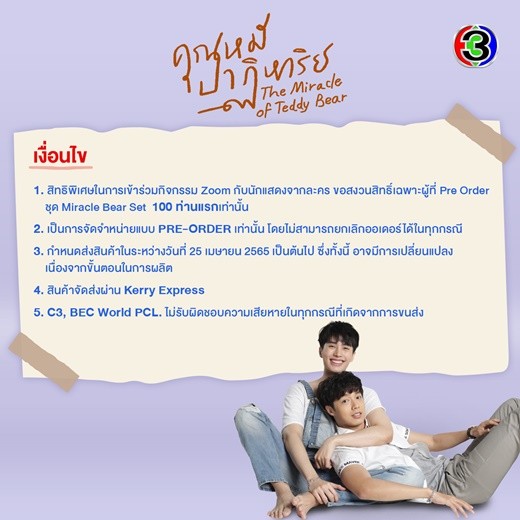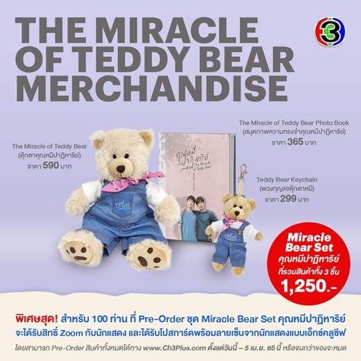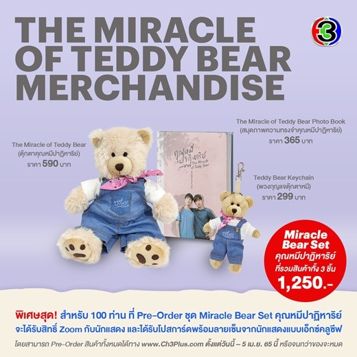 โดย 100 ท่าน ที่พรีออเดอร์ชุดนี้จะได้รับสิทธิ์พิเศษ ZOOM พูดคุยกับนักแสดงจากละคร “คุณหมีปาฏิหาริย์” (The Miracle of Teddy Bear) แถมยังได้รับโปสต์การ์ดพร้อมลายเซ็นจากนักแสดงแบบเอ็กซ์คลูซีฟอีกด้วย บอกเลยว่าชุด “Miracle Bear Set คุณหมีปาฏิหาริย์” คุ้มสุด ๆ ไปเลยจ้า