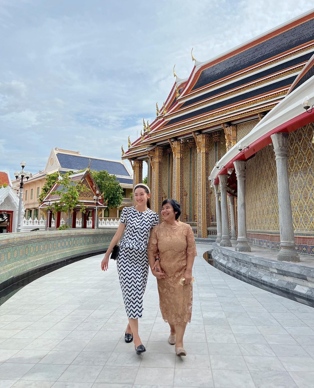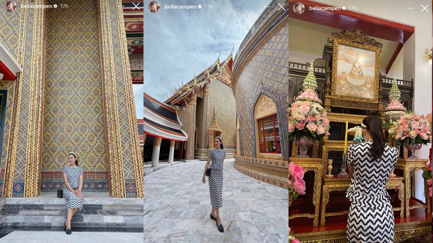แต่วันนี้ 3Plus ขอเปลี่ยนธีมจากชุดไทยมาเป็นชุดเดรสสวยเก๋กับลุคเข้าวัดทำบุญของสาวเบลล่ามาฝากกัน โดยลุคนี้สาวเบลล่าได้โพสต์เอาไว้ในอินสตาแกรมส่วนตัวของเธอ ซึ่งเป็นภาพขณะที่สาวเบลล่า คุณแม่ พร้อมด้วยคนบันเทิง อาทิ ก้อง ปิยะ, ท็อป ดารณีนุช, รอน ภัทรภณ ฯลฯ ไปร่วมทำบุญด้วยกันที่วัดสุทัศนเทพวรารามราชวรมหาวิหาร และวัดราชบพิธสถิตมหาสีมารามราชวรวิหาร พร้อมเขียนข้อความว่า “ธรรมะจัดสรรให้ได้มาเจอกัน นำบุญมาฝากนะคะ” โดยมีแฟนคลับจำนวนมากต่างร่วมคอมเมนต์อนุโมทนาด้วย