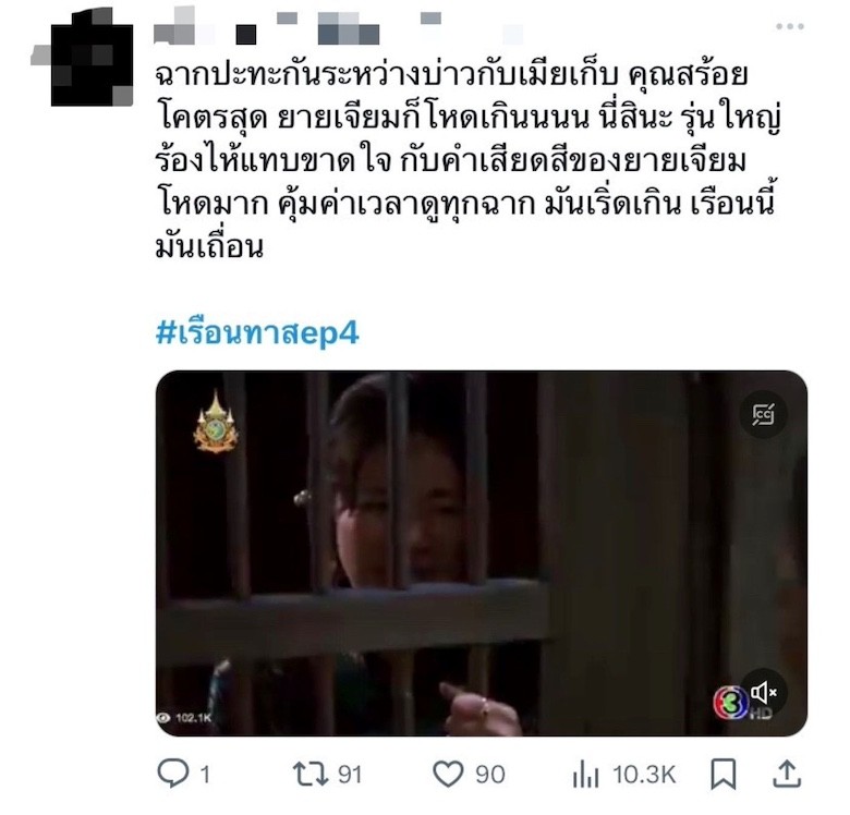 กลายเป็นละครที่คนดูลุ้นตาไม่กระพริบทีเดียว สำหรับ “เรือนทาส” ช่อง 3 ที่ทำเอาชาวโซเชียลแต่ละคนสวมวิญญาณนักสืบตามไขปมปริศนา “ผีมะลิ” ช่วยน้อง บุษบง (อ๊ะอาย กรณิศ) กันใหญ่ แถมเรื่องราวยังค่อย ๆ เผยตัวละครใหม่เพิ่มความเข้มข้นขึ้นเรื่อย ๆ และจากพยานปากเอก ยายเจียม(เอี้ยง สวนีย์) ได้เปิดปากเล่าความจริงในอดีต ทำคนดูได้เห็นมุมน่าสงสารของ คุณสร้อย (นุ่น ศิรพันธ์) ที่ถูก คุณหญิงแข (นก จริยา) เล่นงานชุดใหญ่ ไม่ว่าจะเป็นการนำ คุณราตรี แสดงโดย “แคร์ ฉัตรฑริกา” มาเป็นสะใภ้ใหญ่ไม่พอ ยังยินดีให้คุณธรรมนำบ่าว มะลิ (บูม สุภาพร) มาเป็นเมียอีกคน เพราะเหตุนี้หรือไม่ที่ทำให้คุณสร้อยต้องร้ายปะทะเดือดกับคุณหญิงแขแบบถึงพริกถึงขิง แถมยังหึงหวงคุณธรรมไปทั่ว แม้แต่บุษบงเองก็ไม่เว้น เรียกว่าเรื่องนี้บุษบงสู้ชีวิตทุกอีพีทั้งโดนตบ โดนถีบ จนน้ำตาล่วงบีบหัวใจแฟน ๆ ให้เอ็นดูกันทั่วหน้า แต่พอได้ เกื้อกูล (ตี๋ ธนพล) มาช่วยปกป้องก็ทำแฟน ๆ ใจฟูขึ้นมาทันที แต่ที่ทำคนดูอินจัดอยากหยุมหัวมากที่สุด ต้องยกให้ตัวต้นเรื่องความวุ่นวายทั้งหมด นั้นก็คือ คุณธรรม แสดงโดย “อ้วน รังสิต”