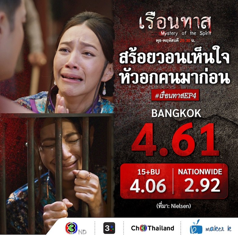 ฝีมือการแสดงของแต่ละคนท็อปฟอร์มขนาดนี้ ทำโซเชียลร้อนระอุ #เรือนทาสEP3 และ #เรือนทาสEP4 ติดเทรนด์ X ของประเทศไทย ส่งผลให้เรตติ้ง เรือนทาส EP.3 พุ่งทะลุทะลวง เรตติ้งกลุ่มผู้ชมกรุงเทพฯ สูงลิ่วถึง 5.19 เรตติ้งกลุ่มผู้ชมอายุ 15 ปี ขึ้นไป หรือ กลุ่ม 15 BU+ (Bangkok and Urban) ทำไปได้มากถึง 4.35 และเรตติ้งรวมทั่วประเทศ (NATIONWIDE) คว้าไปได้ 2.90 ส่วน เรือนทาส EP.4 คว้าเรตติ้งกลุ่มผู้ชมกรุงเทพฯ ทำไปได้ 4.61 เรตติ้งกลุ่มผู้ชมอายุ 15 BU+ (Bangkok and Urban) พุ่งสูง 4.06 และเรตติ้งรวมทั่วประเทศ (NATIONWIDE) คว้าไป 2.92 ถือว่าเป็นที่หน้าพอใจสำหรับละครพีเรียดรสแซ่บที่ห่างหายจากหน้าจอช่อง 3 ไปนาน