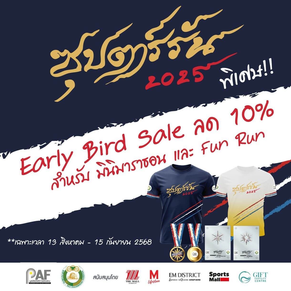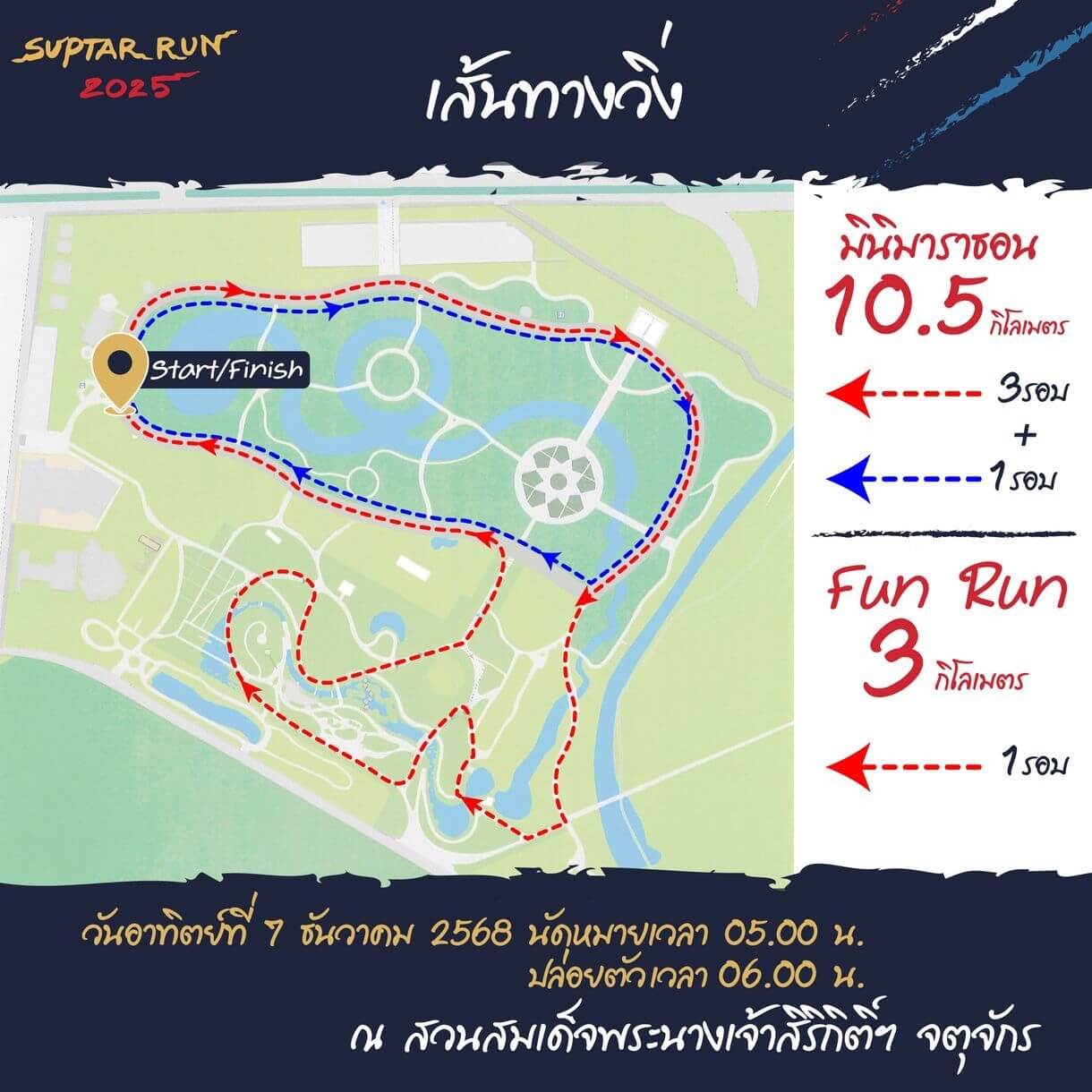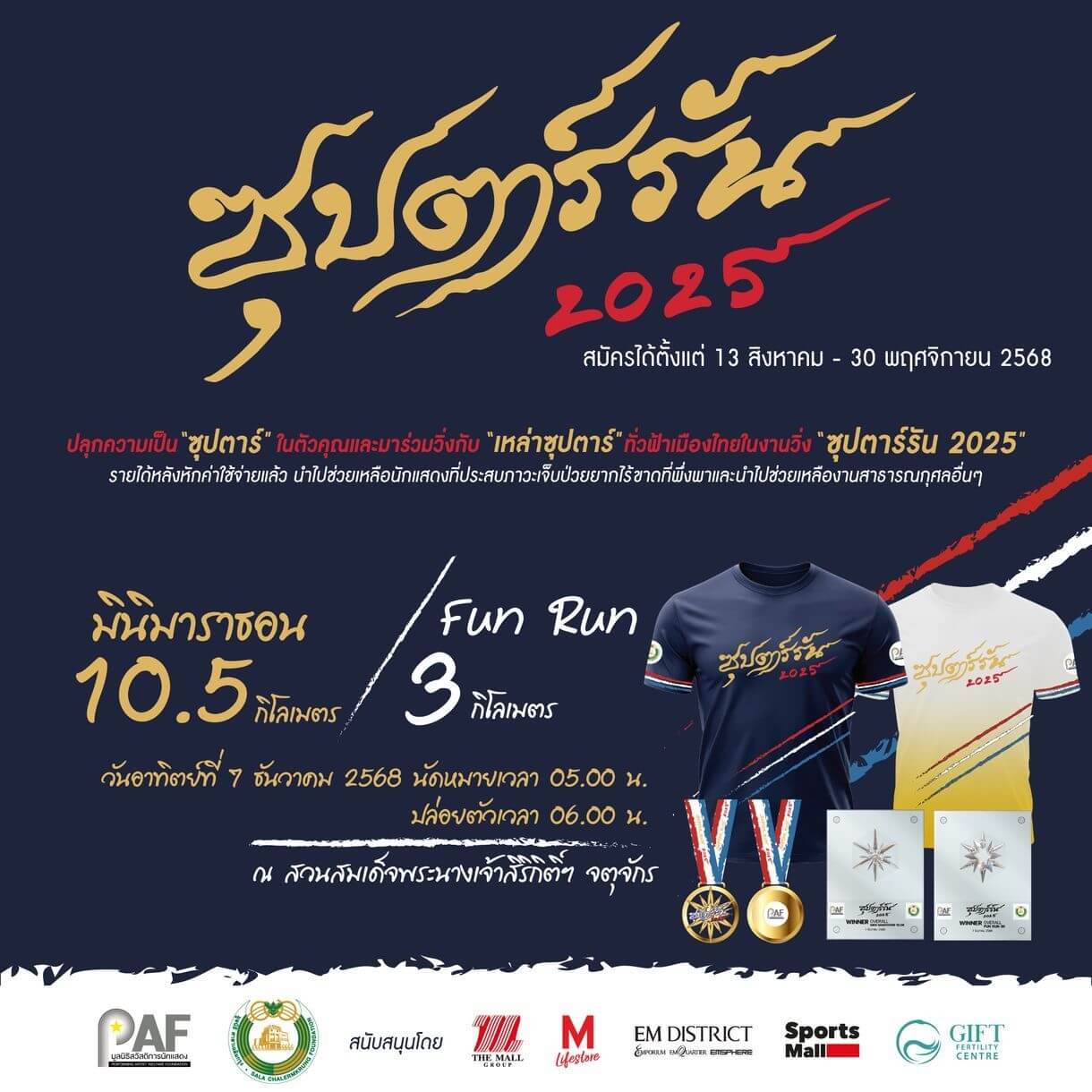 สำหรับงานวิ่งการกุศล “ซุปตาร์รัน 2025” จัดขึ้น 2 แบบ ได้แก่ “วิ่งแบบทั่วไป” มินิมาราธอน 10.5 และ 3 กิโลเมตร พิเศษบัตร Early Bird Sale ลด 10% ทั้ง 2 รายการเมื่อสมัครตั้งแต่วันนี้ - 15 กันยายน 2568 และ “แบบเวอร์ชวล รัน” (Virtual Run) ) สะสมระยะทาง 90 กิโลเมตร เริ่มส่งผลได้ตั้งแต่วันที่ 7 พฤศจิกายน 2568 - 15 ธันวาคม 2568 (1 เดือน) ทั้งนี้สามารถสะสมระยะทางการวิ่งผ่านทางแอปพลิเคชั่น บนโทรศัพท์ที่มีอุปกรณ์จับเวลา ระยะทาง และ สัญญาณ GPS โดยผู้ที่สนใจ สามารถสมัครผ่านช่องทาง https://race.thai.run/suptarrun2025 และhttps://race.thai.run/suptarrun2025vr ผู้สมัครทุกประเภทจะได้รับเสื้อวิ่ง ออกแบบโดยอ.เฉลิมชัย โฆษิตพิพัฒน์ ศิลปินแห่งชาติ เตรียมพร้อมลงแข่งขันลุ้นเหรียญรางวัล และโล่รางวัลแยกตามประเภทต่างๆ ในวันอาทิตย์ที่ 7 ธันวาคม 2568 เวลา 05.00 - 09.00 น. ณ สวนสมเด็จพระนางเจ้าสิริกิติ์ฯ เขตจตุจักร