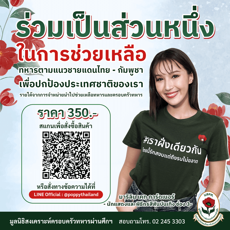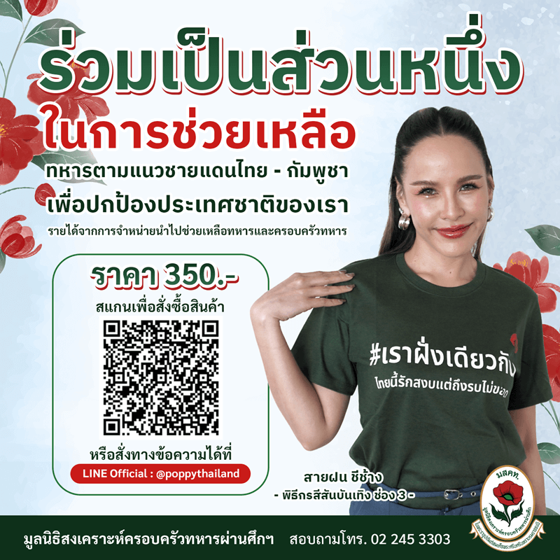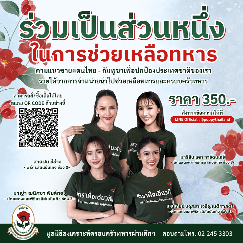 4 สาวพิธีกรสีสันบันเทิง สายฝน ชีช้าง - มาริลิน เคท การ์ดเนอร์ - เรนเดียร์ ปฤสยา เจริญเนติศาสตร์ และ มาญ่า ฌนิศชา พิมล์ทอง นัดสวมเสื้อ รวมตัวส่งกำลังใจพี่ๆทหารที่ปฏิบัติภารกิจชายแดนไทย – กัมพูชา งานนี้ใครอยากสวย หล่อ เท่ แถมมาร่วมเป็นส่วนหนึ่งในการช่วยเหลือพี่ๆทหารหาญ สามารถสั่งซื้อเสื้อยืดเทรนเก๋ๆ จาก "มูลนิธิสงเคราะห์ครอบครัวทหารผ่านศึก" คอลเลกชันใหม่ล่าสุด สัมผัสได้ถึงความรักชาติ ในราคา 350 บาท ได้ที่ LINE Official Shop: https://shop.line.me/@poppythailand โดยรายได้จากการจำหน่ายนำไปช่วยเหลือทหารและครอบครัวทหารต่อไป...