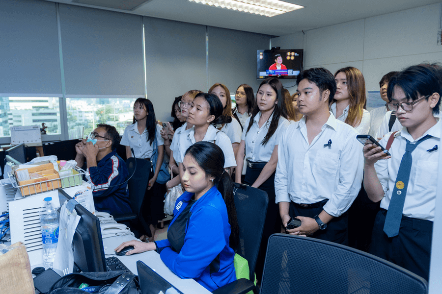 จากนั้น คณะฯ ได้เยี่ยมชมทุกขั้นตอนของกระบวนการการทำงานของสำนักข่าวช่อง 3 ตั้งแต่การเตรียมข้อมูล การจัดทำสคริปต์ข่าว การตัดต่อภาพ ไปจนถึงขั้นตอนการออกอากาศจริงแบบเรียลไทม์ ผ่านการเข้าสังเกตการณ์การถ่ายทอดสดรายการข่าว “เที่ยงวันทันเหตุการณ์” โดยทีมพิธีกร ดร.อริสรา กำธรเจริญ และ อติรุจ กิตติพัฒนะ พร้อมทีมงานข่าวที่ให้ข้อมูลอย่างเป็นกันเอง พร้อมอธิบายถึงความท้าทายที่ต้องรับมือในแต่ละวัน เพื่อให้ผู้ชมได้รับข่าวสารที่ถูกต้อง รวดเร็ว และน่าเชื่อถือ ซึ่งช่วยเปิดมุมมองใหม่ ๆ และสร้างแรงบันดาลใจให้แก่นักศึกษาที่สนใจในสายงานสื่อสารมวลชนได้เป็นอย่างดี
