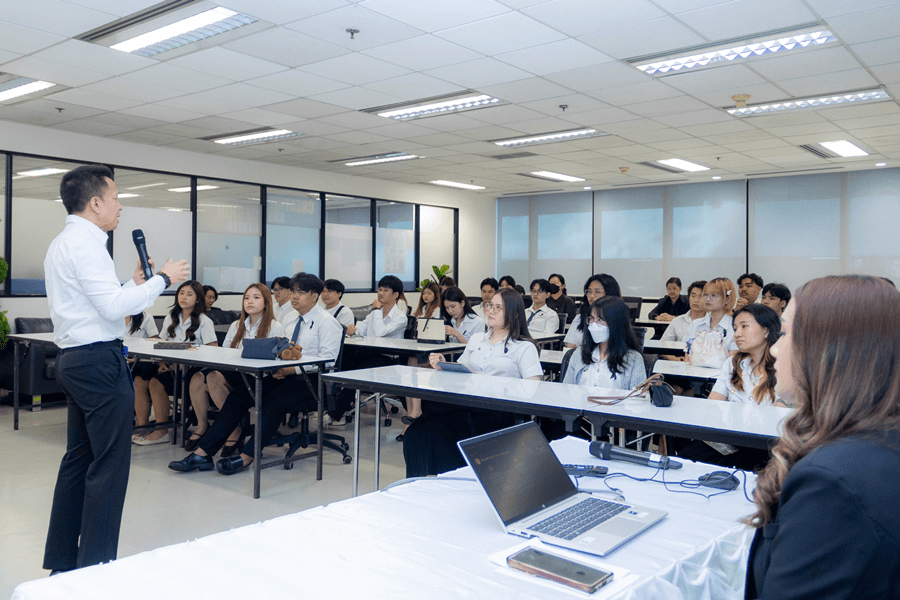เริ่มด้วยการบรรยายพิเศษจาก นายชาคริต ดิเรกวัฒนชัย รองกรรมการผู้อำนวยการ สำนักกิจการและสื่อสารองค์กร โดยถ่ายทอดแนวคิดเบื้องหลังการสื่อสารอย่างมีประสิทธิภาพ การโฆษณาและการประชาสัมพันธ์ที่ตอบโจทย์ผู้ชม รวมถึงบทบาทสำคัญของสื่อมวลชนในยุคดิจิทัล นักศึกษายังได้รับฟังกรณีศึกษาและประสบการณ์จริงที่เกิดขึ้น ทำให้เข้าใจภาพรวมของการสื่อสารในโลกปัจจุบันได้อย่างรอบด้านยิ่งขึ้น