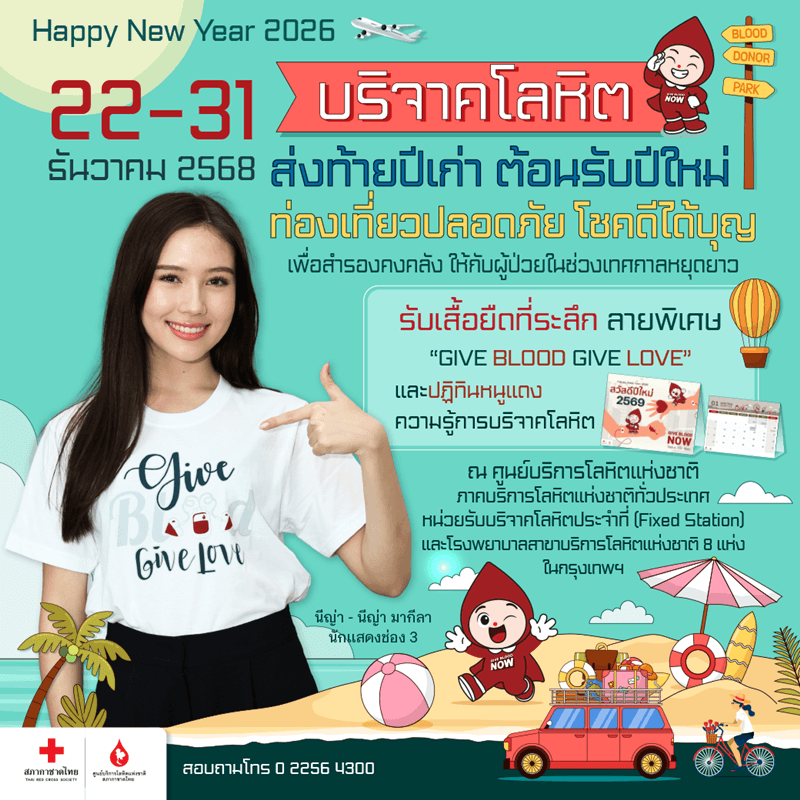 งานนี้นอกจากอิ่มบุญแล้ว ยังรับทันที เสื้อยืดที่ระลึก ลายพิเศษ "Give Blood Give Love” พร้อมด้วยปฏิทินหนูแดง สวัสดีปีใหม่ 2569 สอดแทรกความรู้เสมือนคู่มือของนักบริจาคโลหิตไปใช้ต้อนรับศักราชใหม่ ขอย้ำว่าของที่ระลึกมีจำนวนจำกัด ไม่ควรปล่อยให้โอกาสดีๆหลุดมือ ไม่ว่าด้วยประการใดก็ตาม