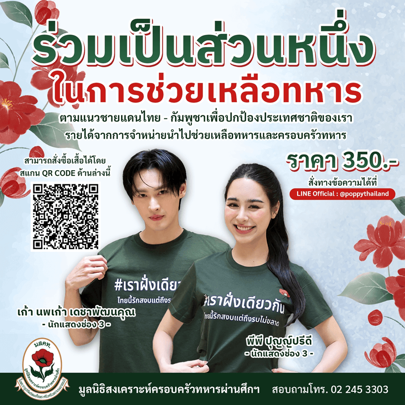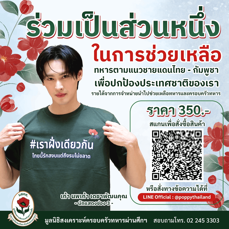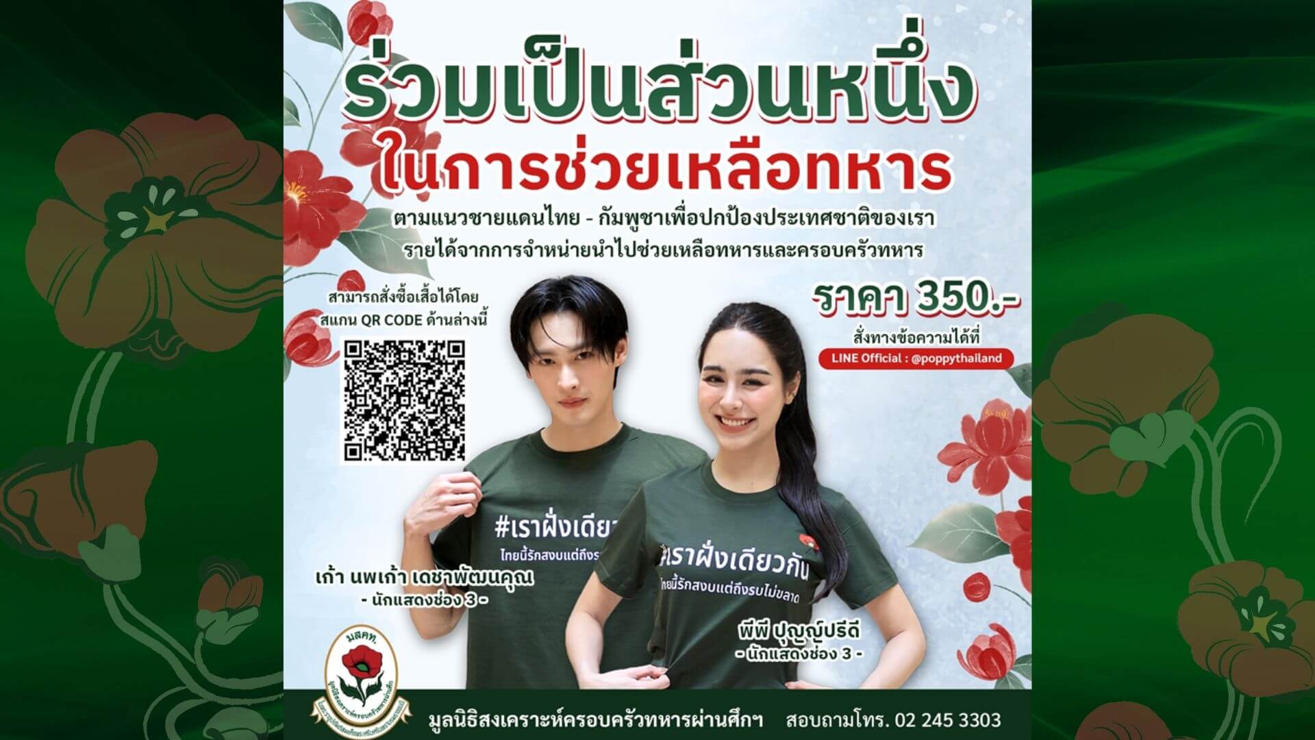 ใครที่กำลังเตรียมหาของขวัญ ส่งท้ายปีเก่า ต้อนรับปีใหม่ คู่นักแสดงเคมีโดนใจแฟนคลับจากช่อง 3อย่าง “เก้า นพเก้า – พีพี ปุญญ์ปรีดี” เลยจูงมือกันมาชวนแฟนๆ และคนไทยทุกคน ร่วมส่งแรงใจให้กับนักรบแนวหน้า มอบของขวัญให้กับคนพิเศษในช่วงเทศกาลสำคัญด้วยเสื้อยืดคอลเลกชัน “เราฝั่งเดียวกัน” จากมูลนิธิสงเคราะห์ครอบครัวทหารผ่านศึก รายได้จากการจำหน่ายนำไปช่วยเหลือพี่ ๆ ทหารและครอบครัว ที่ปฏิบัติภารกิจแนวชายแดนไทย–กัมพูชา รวมพลังสามัคคีให้ผ่านวิกฤตนี้ไปด้วยกัน