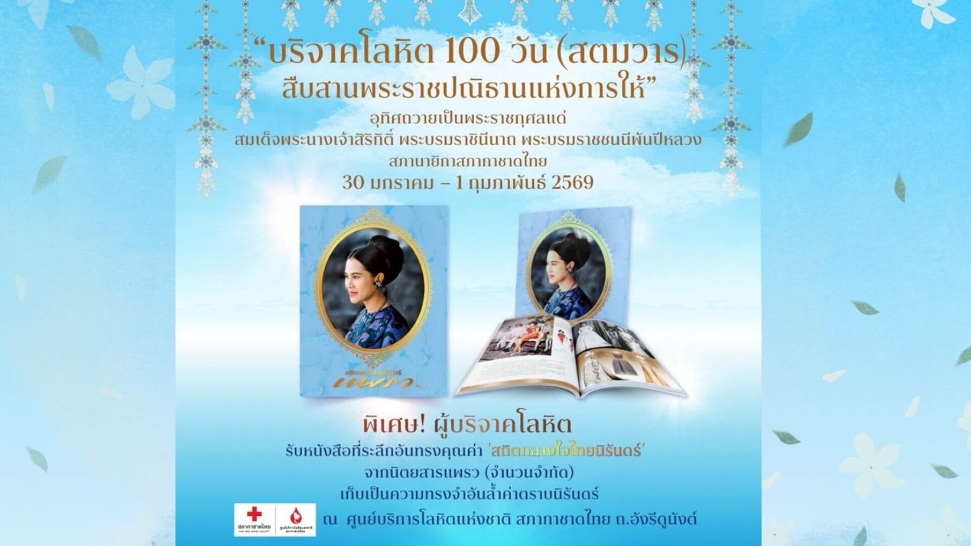 ศูนย์บริการโลหิตแห่งชาติ เชิญชวนประชาชนชาวไทย สืบสานพระราชปณิธานแห่งการให้ บริจาคโลหิตอุทิศถวายเป็นพระราชกุศลแด่ สมเด็จพระนางเจ้าสิริกิติ์ พระบรมราชินีนาถ พระบรมราชชนนีพันปีหลวง สภานายิกาสภากาชาดไทย เนื่องในวาระครบ 100 วัน (สตมวาร) ระหว่างวันที่ 30 มกราคม - 1 กุมภาพันธ์ 2569 รับหนังสือที่ระลึกทรงคุณค่า “สถิตกลางใจไทยนิรันดร์” (สนับสนุนโดย นิตยสารแพรว)