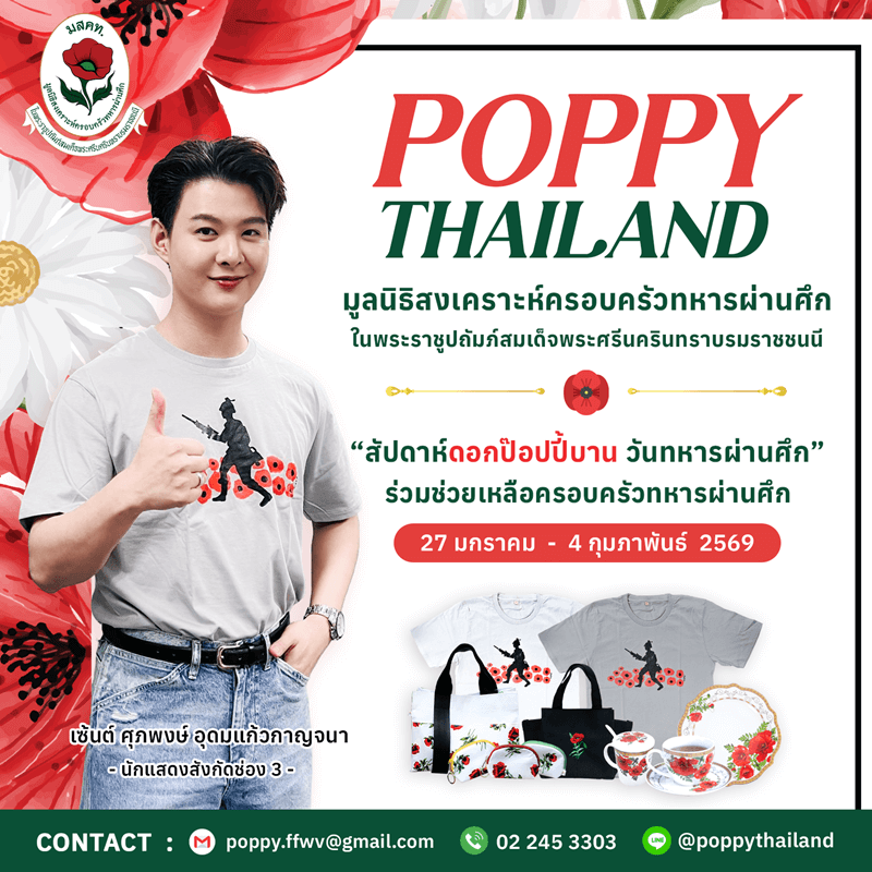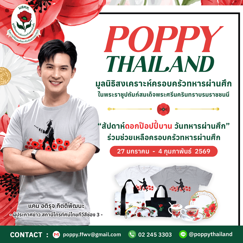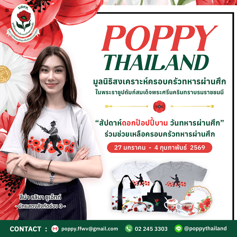 โดยได้ผู้ประกาศข่าวรายการเที่ยงวันทันเหตุการณ์อย่าง ดร.หมวย อริสรา กำธรเจริญ รวมตัวนักแสดง ลีน่า ลลินา ชูเอ็ทท์ - เซ้นต์ ศุภพงษ์ อุดมแก้วกาญจนา พร้อม 2 ผู้ประกาศ แคน อติรุจ กิตติพัฒนะ - เซน เมจกา สุพิชญางกูร นัดสวมเสื้อ หนึ่งในผลิตภัณฑ์จากมูลนิธิสงเคราะห์ครอบครัวทหารผ่านศึก ในพระราชูปถัมภ์สมเด็จพระศรีนครินทราบรมราชชนนี เดินหน้าส่งต่อเรื่องดีๆ ชวนร่วมเลือกซื้อดอกป๊อปปี้ ดอกไม้ที่ระลึกสัญลักษณ์วันทหารผ่านศึก พร้อมหลากหลายผลิตภัณฑ์ของมูลนิธิฯ เพื่อหารายได้ช่วง “สัปดาห์ดอกป๊อปปี้บานวันทหารผ่านศึก” โดยเริ่มตั้งแต่วันนี้ - 4 กุมภาพันธ์ 2569 ทั้งนี้ประชาชนทั่วไปสั่งซื้อดอกป๊อปปี้และ ผลิตภัณฑ์ได้ที่ มูลนิธิสงเคราะห์ครอบครัวทหารผ่านศึก ในพระราชูปถัมภ์สมเด็จพระศรีนครินทราบรมราชชนนี