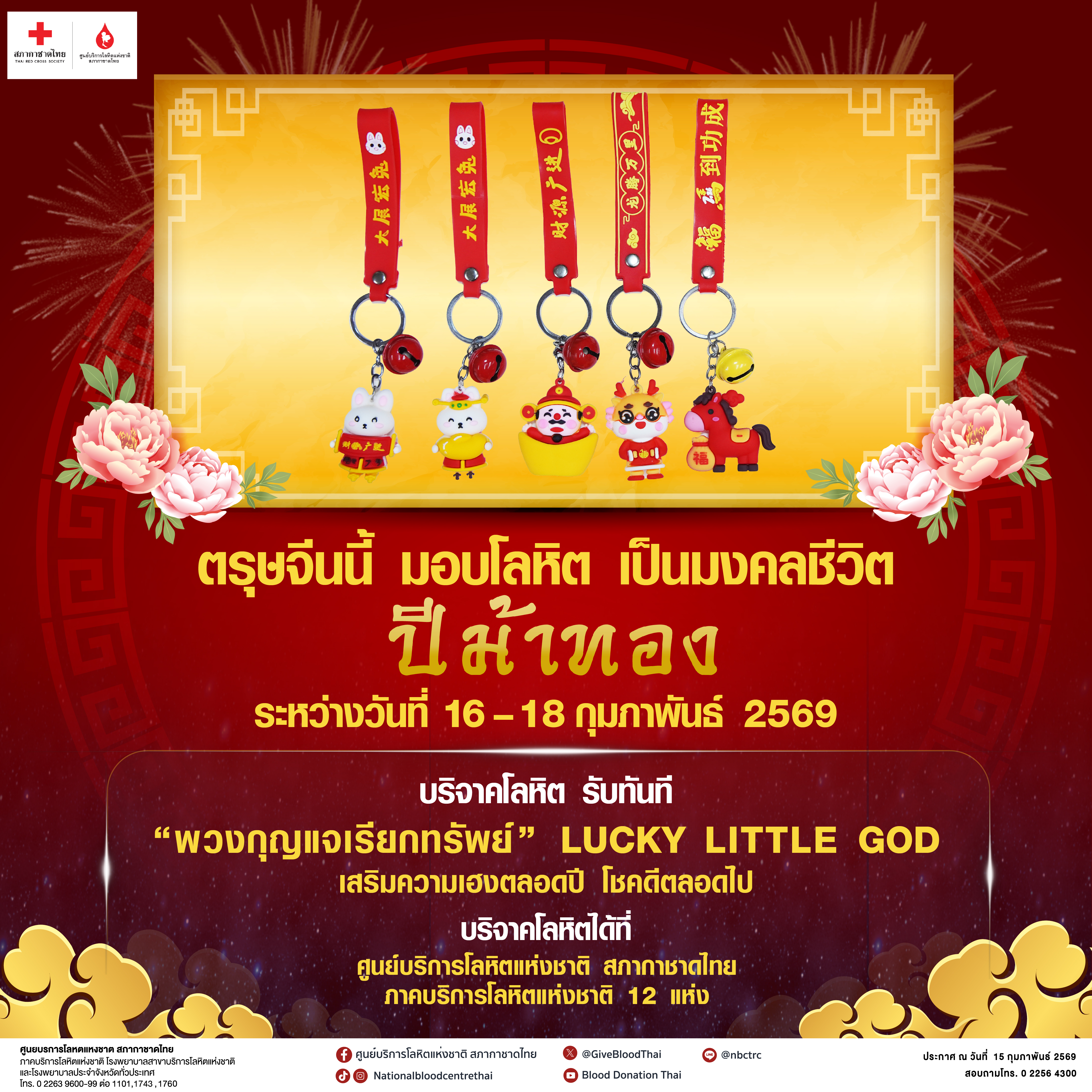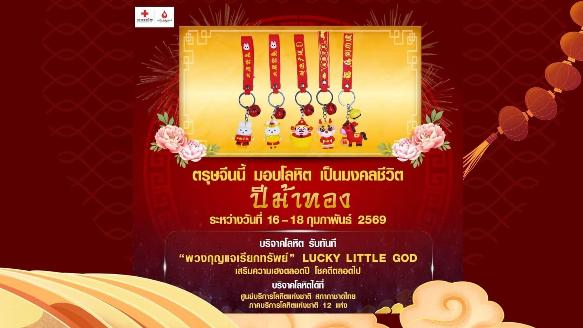 ศูนย์บริการโลหิตแห่งชาติ สภากาชาดไทย เชิญชวนชาวไทยเชื้อสายจีน และประชาชนทั่วไป ฉลองเทศกาลตรุษจีน สร้างบุญเสริมเฮง รับปีม้าทอง มอบโลหิตเป็นมงคลชีวิต ระหว่างวันที่ 16 – 18 กุมภาพันธ์ 2569 ณ ศูนย์บริการโลหิตแห่งชาติ สภากาชาดไทย และภาคบริการโลหิตแห่งชาติ 12 แห่ง ทั่วประเทศ รับทันที “พวงกุญแจเรียกทรัพย์” Lucky Little God เป็นที่ระลึก