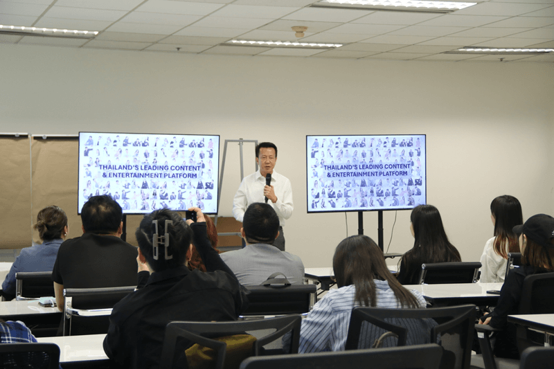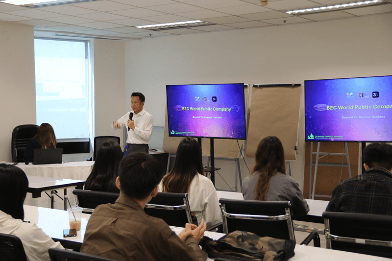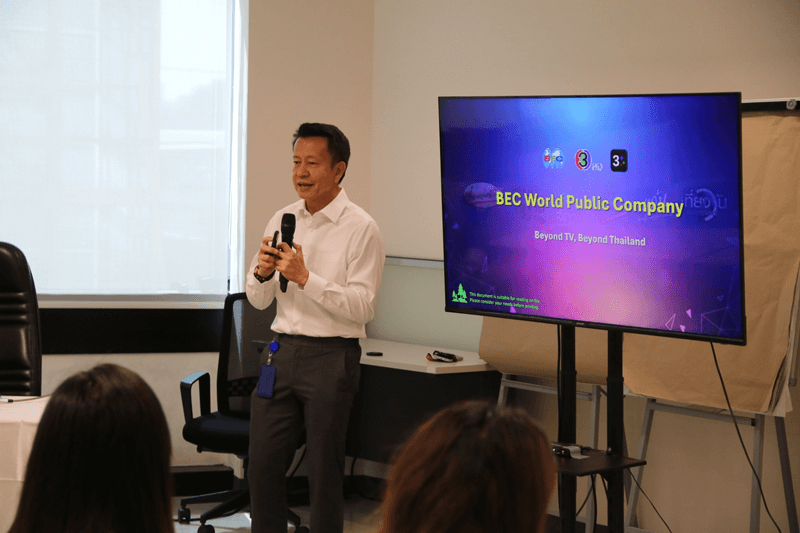 โดยได้รับเกียรติจาก คุณชาคริต ดิเรกวัฒนชัย รองกรรมการผู้อำนวยการ - สำนักกิจการและสื่อสารองค์กร บรรยายภาคภาษาอังกฤษ ในหัวข้อ " BEC World Public Company Beyond TV, Beyond Thailand " ครอบคลุมเนื้อหา ทั้งในส่วนความเป็นมาของสถานีฯ ภาพรวมการดำเนินธุรกิจและทิศทางการผลิตสื่อ เพื่อให้นักศึกษาได้ทำความรู้ไปปรับประยุกต์ใช้ในการเรียน และการทำงานในอนาคต โดยไฮไลท์สำคัญกับธุรกิจการจัดการดูแลศิลปิน มิติใหม่เพื่อรองรับการปรับตัว และก้าวทันยุคสมัยที่ศิลปินไอดอลได้รับความนิยมอย่างสูงทั้งในและต่างประเทศ รวมทั้งการวางแผนสร้างคอนเทนต์สำหรับผลิตผลงานในอนาคตอีกด้วย