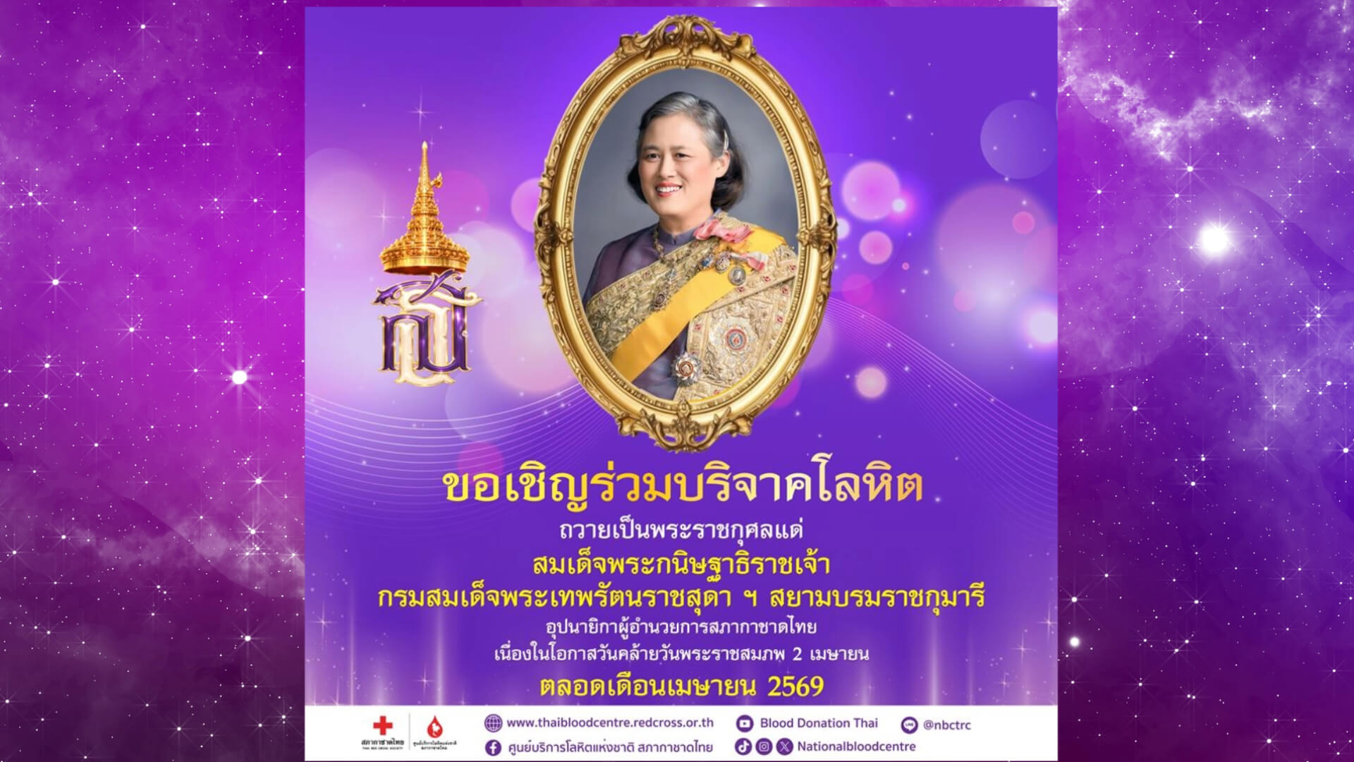 โอกาสนี้ จึงขอเชิญร่วมกิจกรรมบริจาคโลหิตในโครงการ “เรารักกรมสมเด็จพระเทพ ฯ” ตลอดเดือนเมษายน 2569 ได้ทั่วประเทศ ใกล้ที่ไหนบริจาคที่นั่น บริจาคโลหิตได้ที่