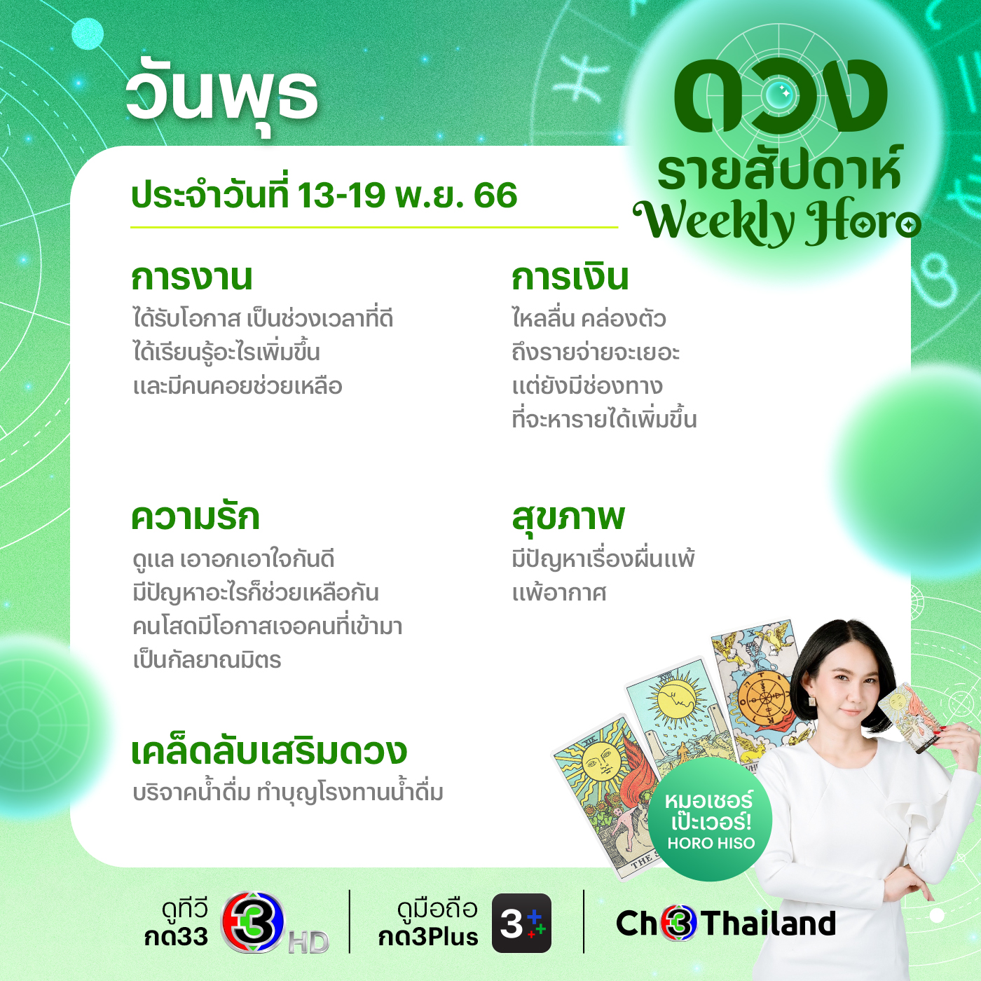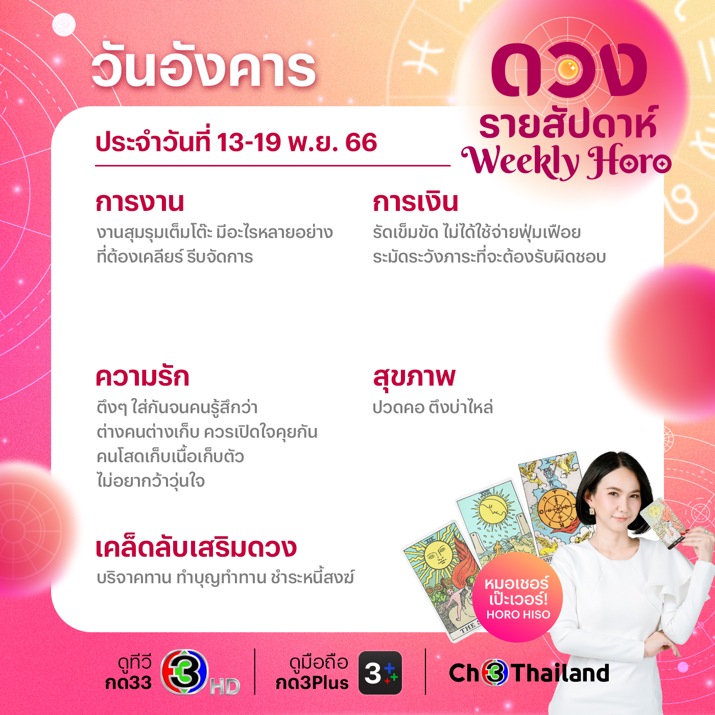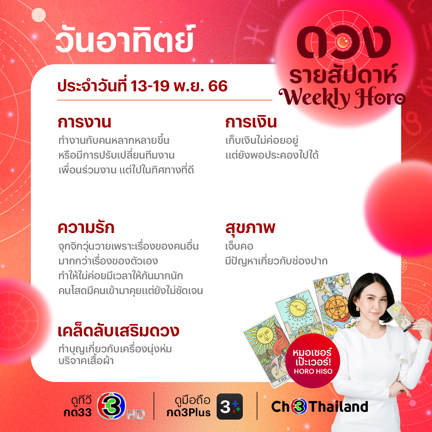 ติดตามดูดวงรายสัปดาห์ของ “หมอเชอร์ เป๊ะเวอร์ Horo Hiso” อัปเดตทุกวันจันทร์ หรือสามารถติดต่อดูดวงส่วนตัวกับคุณจ๋อย (ผู้จัดการส่วนตัว) เบอร์ 083-092-1328